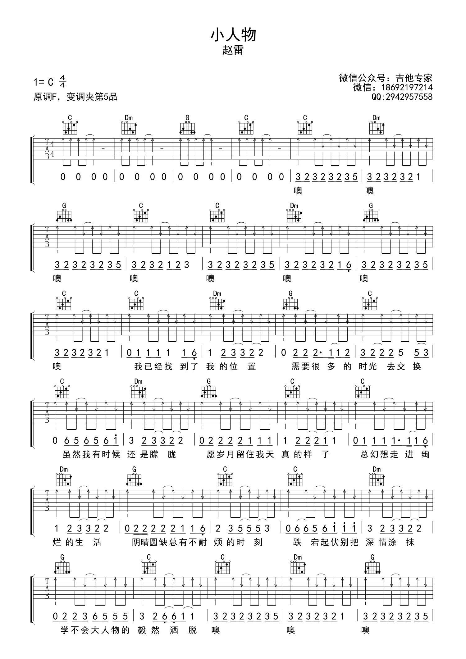 曲谱介绍: 赵雷《小人物》吉他谱,原调F,选用C调指法,变调夹夹五品。赵雷2495巡演新歌完整版,不和贪婪的人相对,不为薄情寡义的人流泪。也许我们始终都只是一个小人物,但这并不妨碍我们选择用什么样的方式生活。我们并非拒绝平凡,我们拒绝的只是平庸,小人物一样也有大梦想。