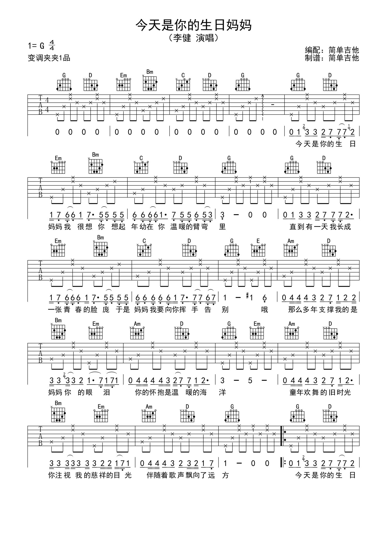 • 今天是你的生日妈妈吉他谱 - 李健 - G调吉他弹唱谱第1张