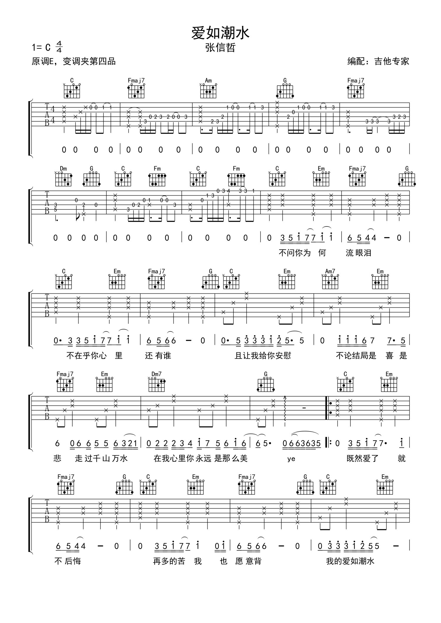 曲谱介绍: 张信哲《爱如潮水》吉他谱_C调吉他弹唱谱