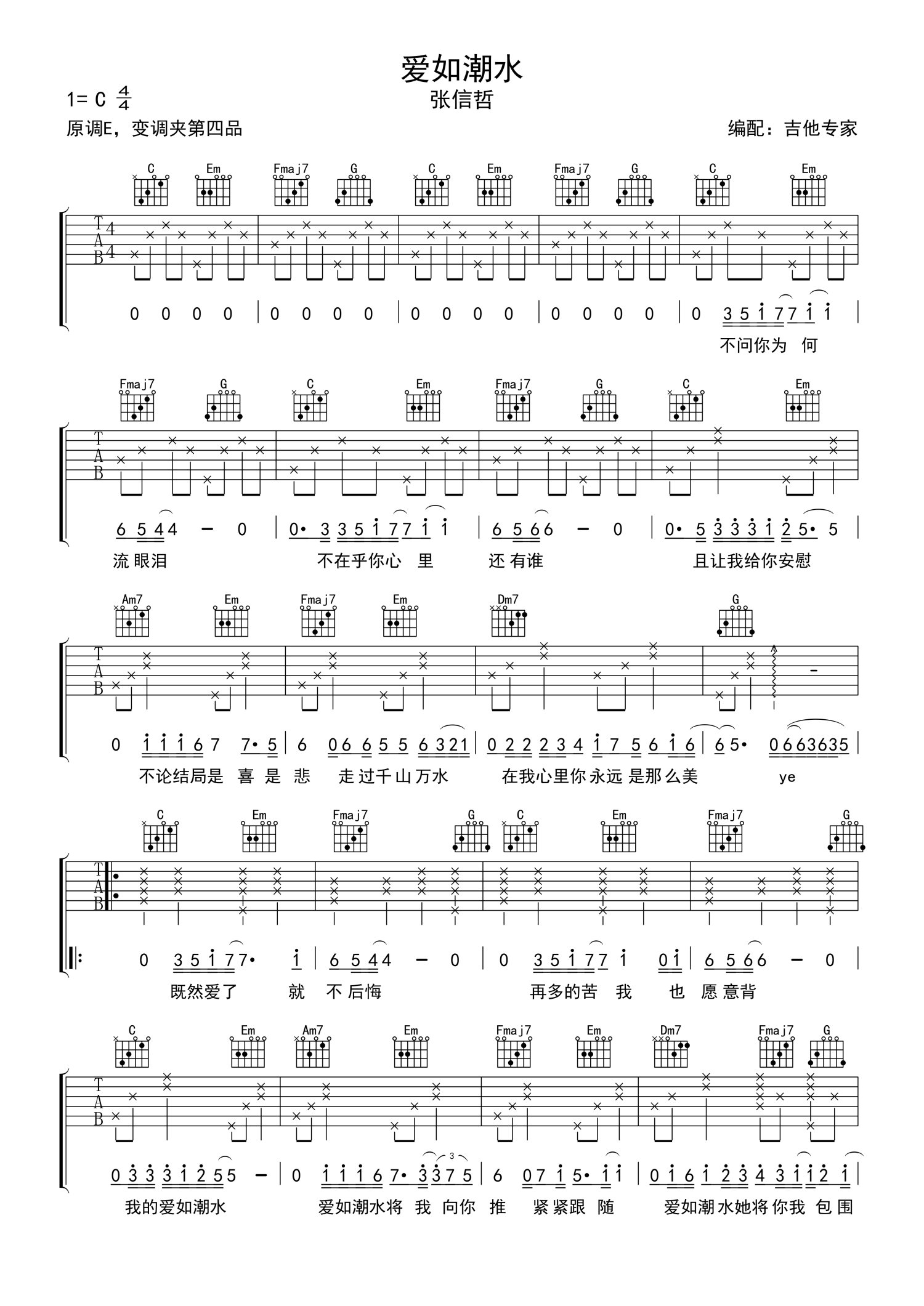 曲谱介绍: 张信哲《爱如潮水》吉他谱_C调吉他弹唱谱_简易版