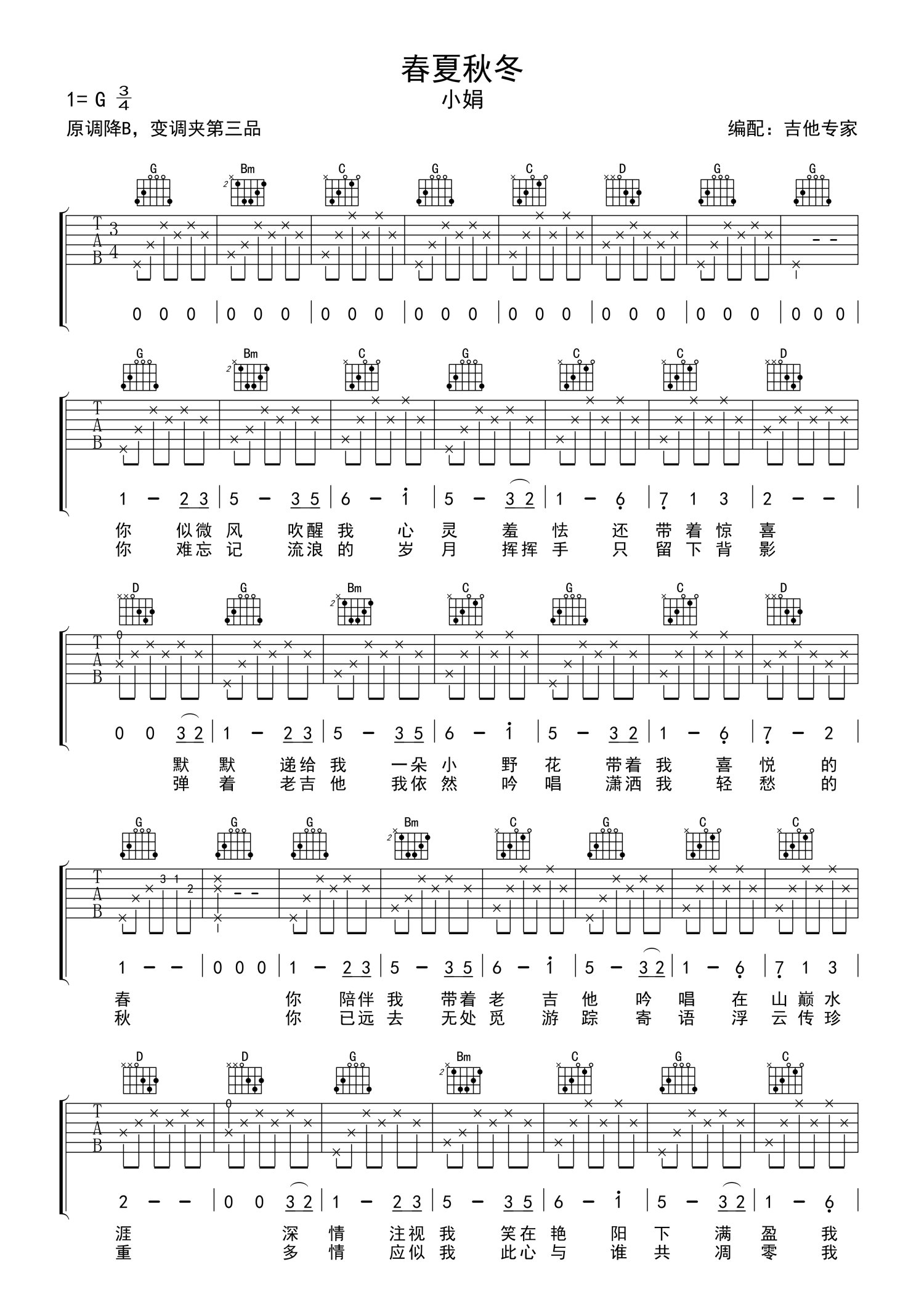 • 春夏秋冬吉他谱 - 小娟 - G调吉他弹唱谱第1张