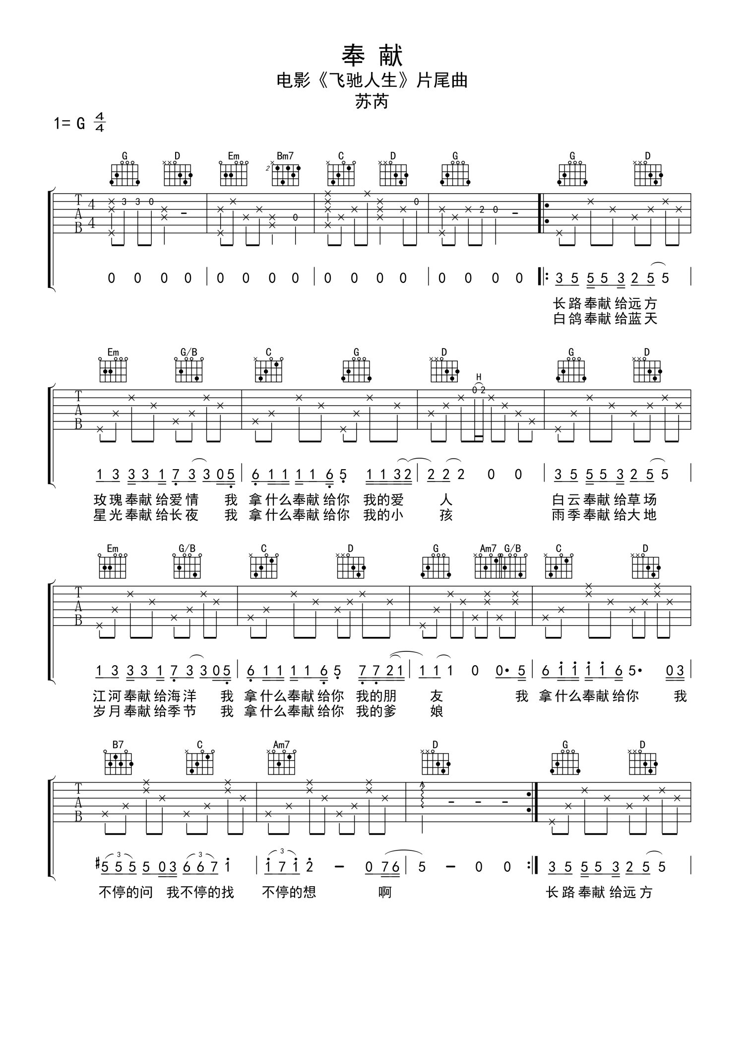 • 奉献吉他谱 - 苏芮 - G调吉他弹唱谱第1张