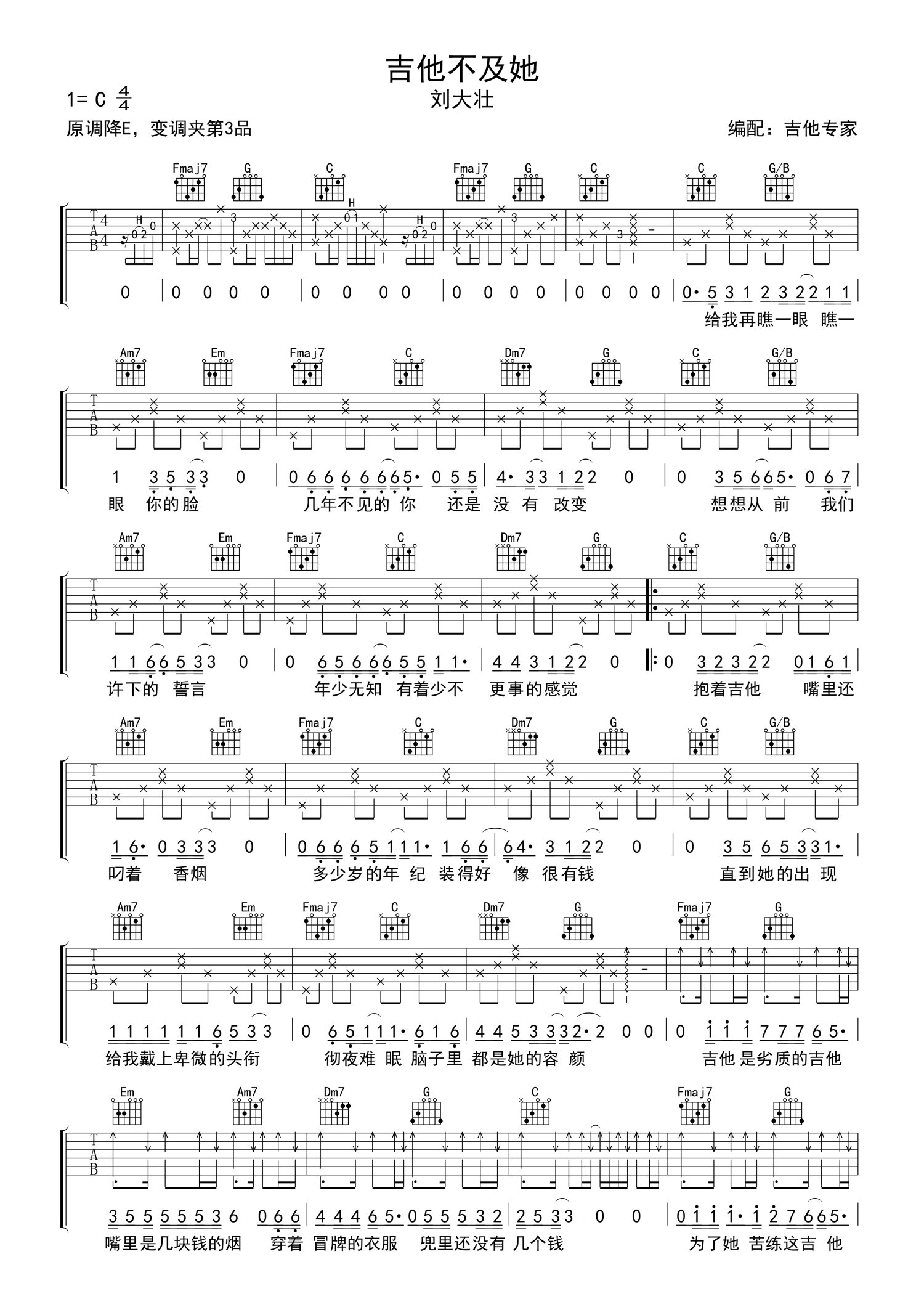 • 吉他不及她吉他谱 - 刘大壮 - C调吉他弹唱谱第1张