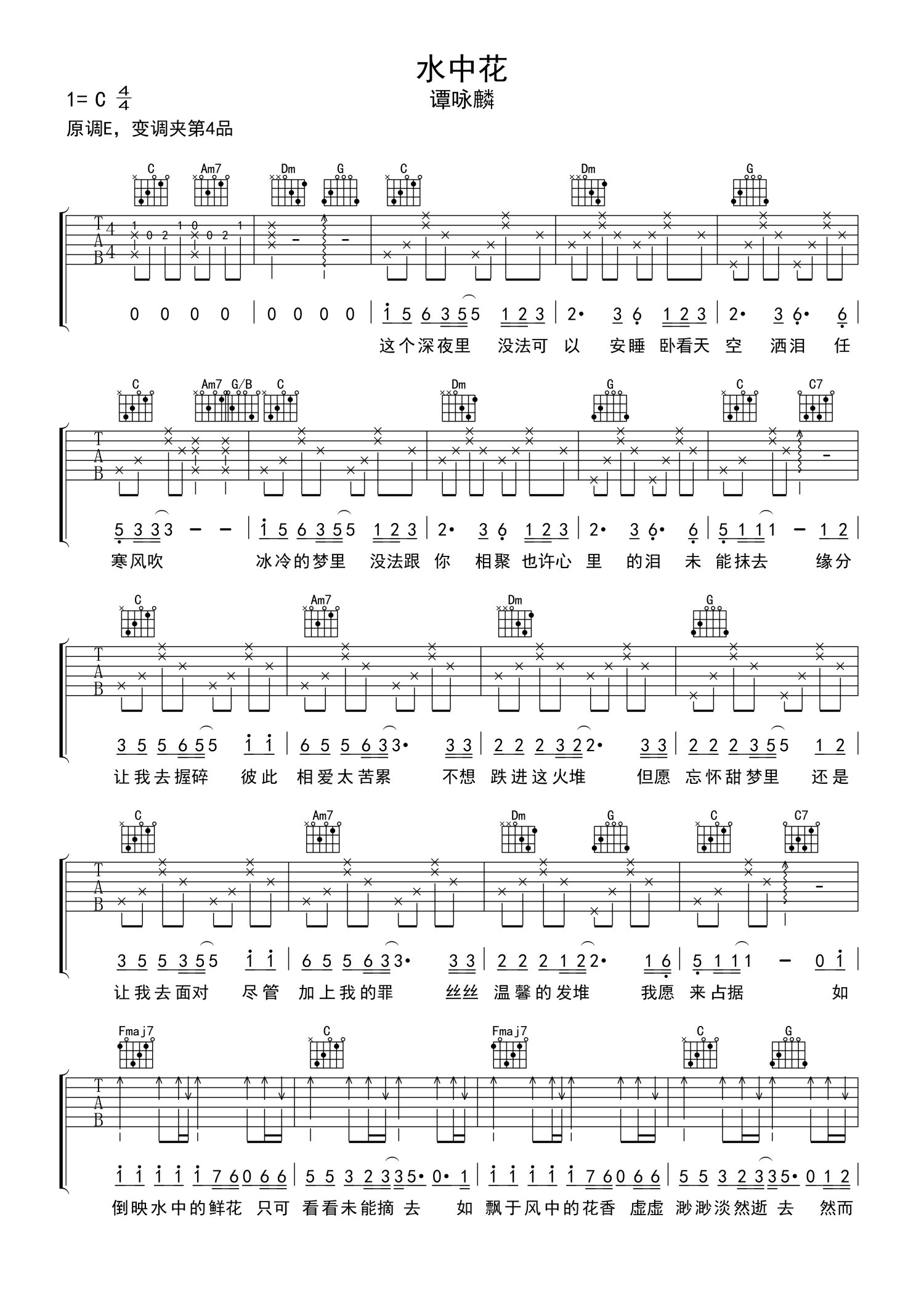 • 水中花吉他谱 - 谭咏麟 - C调吉他弹唱谱第1张