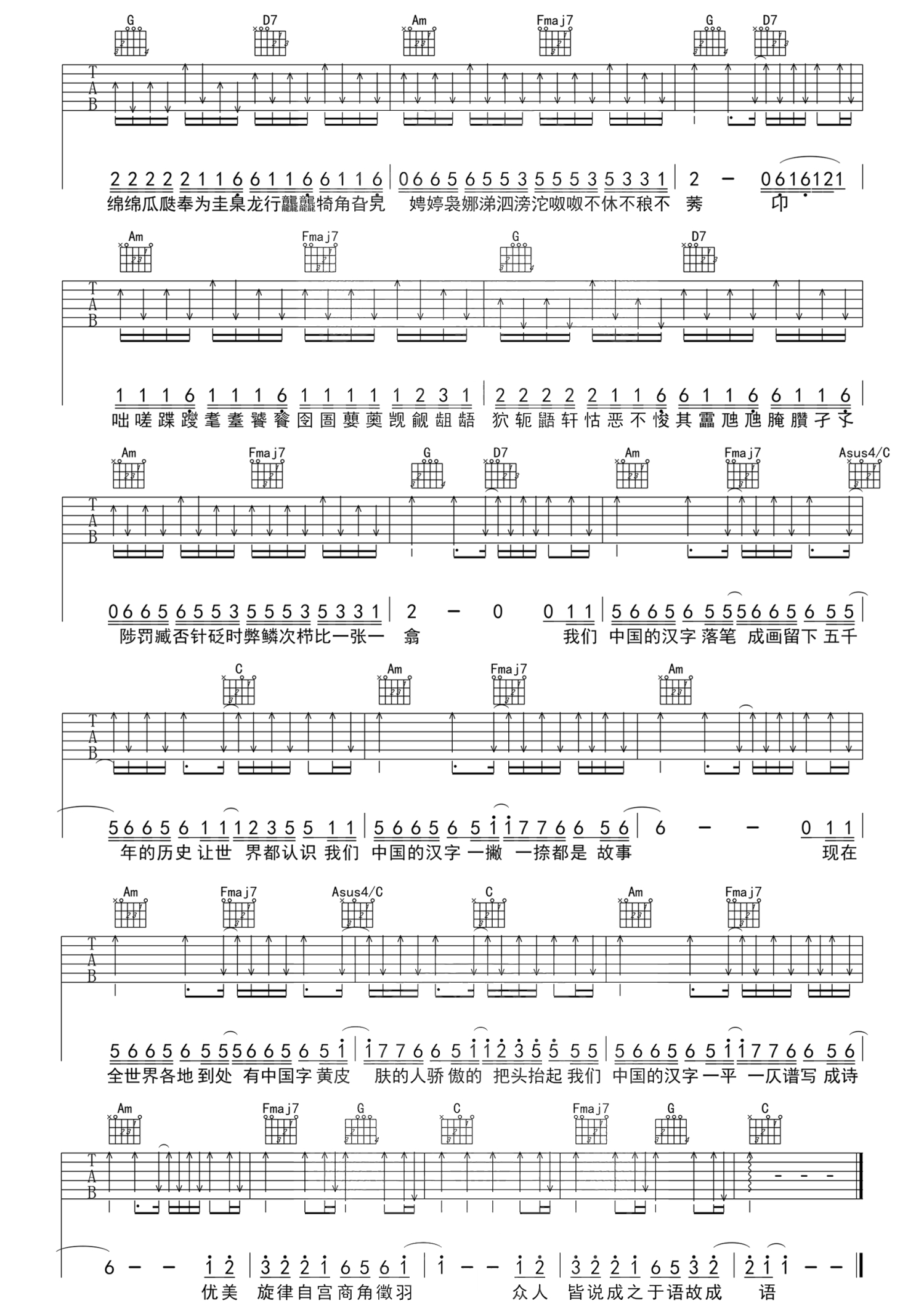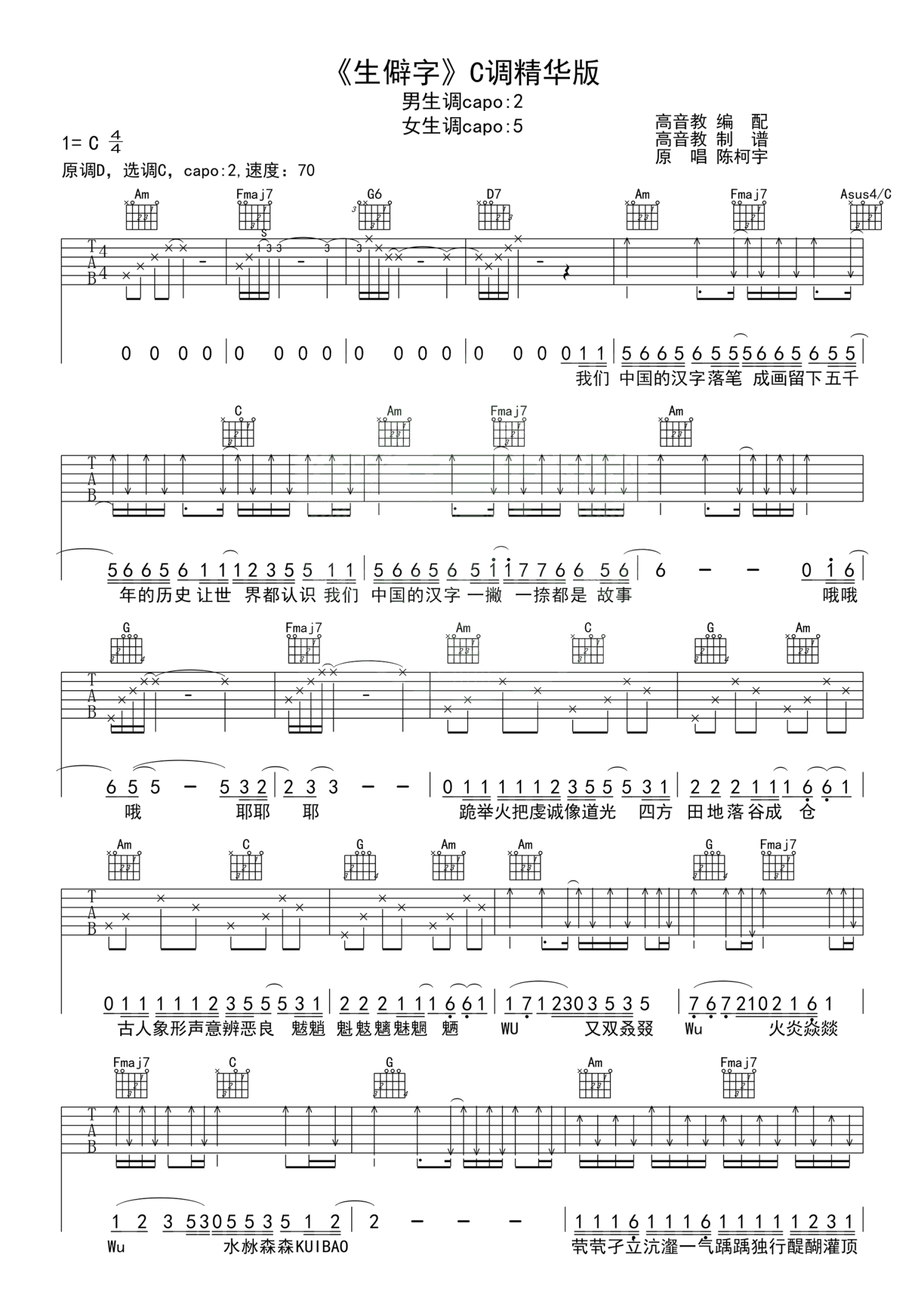 曲谱介绍: 生僻字吉他谱,陈柯宇创作演唱的一首热门歌曲,生僻字吉他弹唱谱,精华版编配,原调D,选用C调指法,capo夹二品,女生建议夹五品。歌里共有70多个生僻字,通过努力我们不仅能学会很好听的一首歌,也让我们认识到更多的中国文化。我们中国的汉字,一撇一捺都是故事,希望中国的汉字,可以传扬到全世界的每个角落~