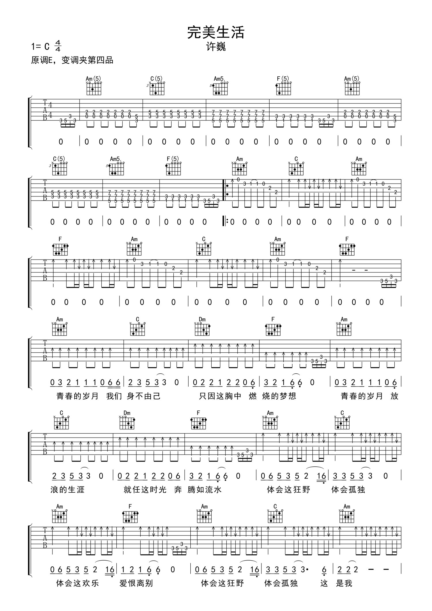 曲谱介绍: 许巍《完美生活》吉他谱_C调吉他弹唱谱