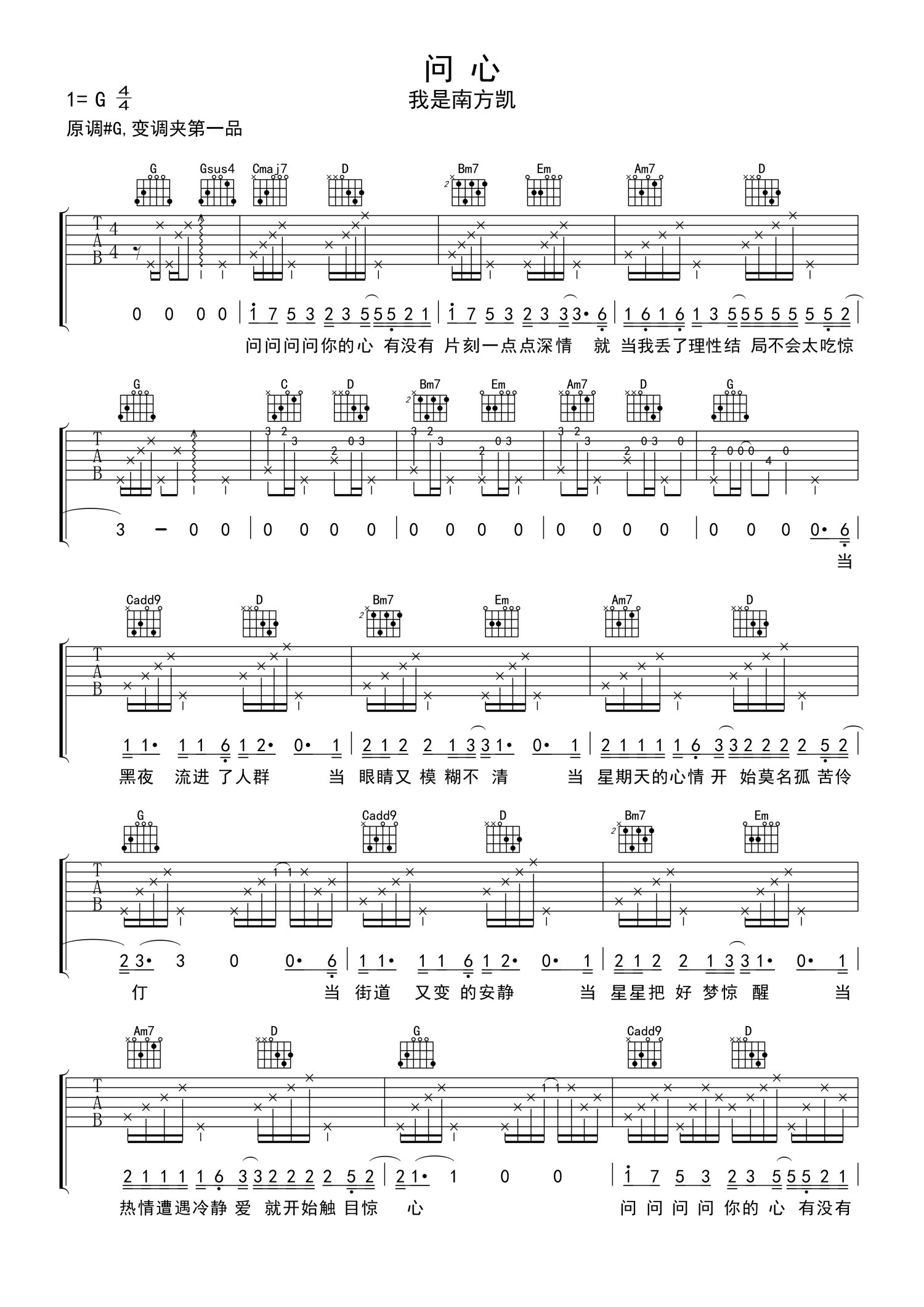 曲谱介绍: 我是南方凯《问心》吉他谱_G调吉他弹唱谱
