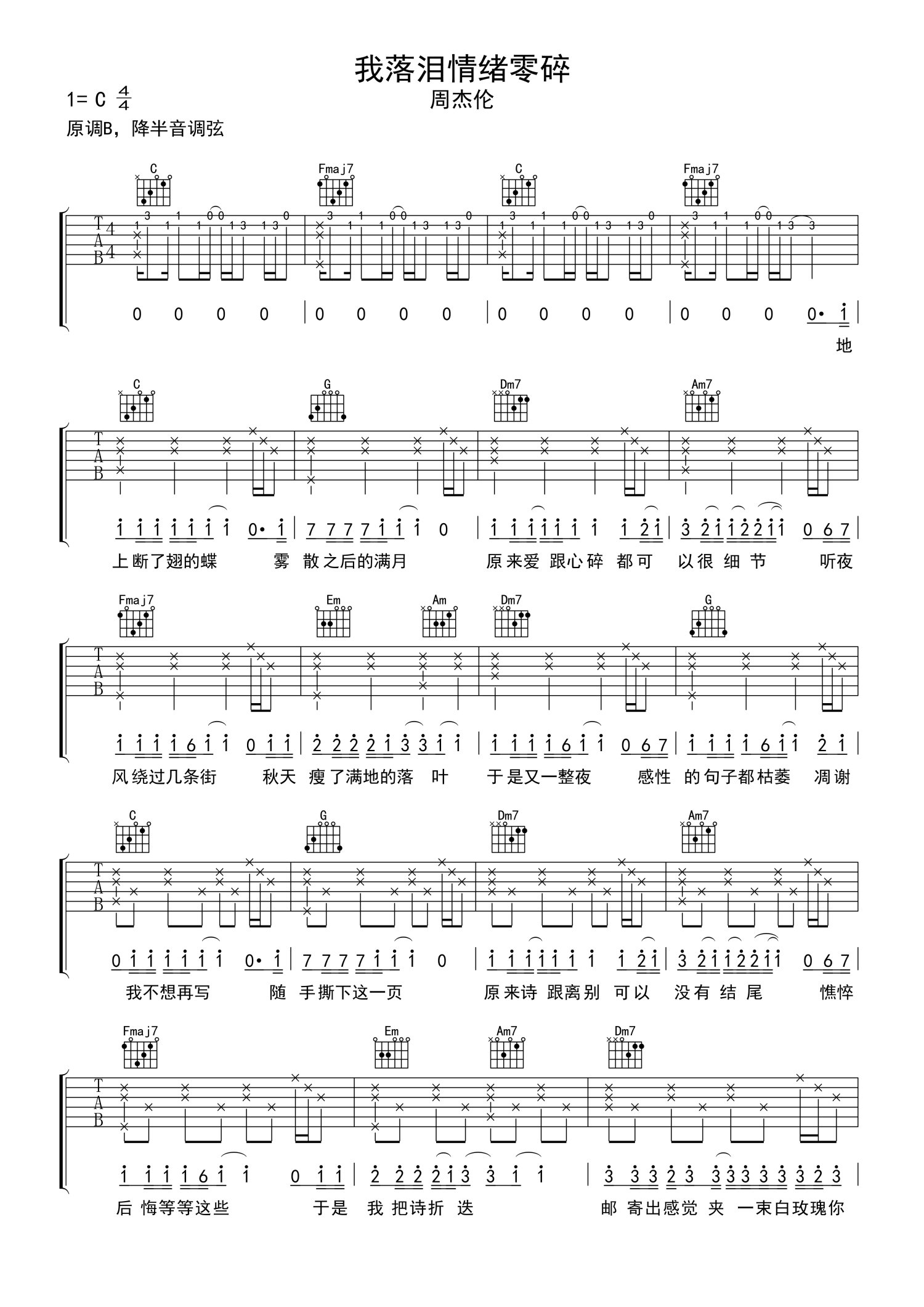 曲谱介绍: 周杰伦《我落泪情绪零碎》吉他谱_C调吉他弹唱谱