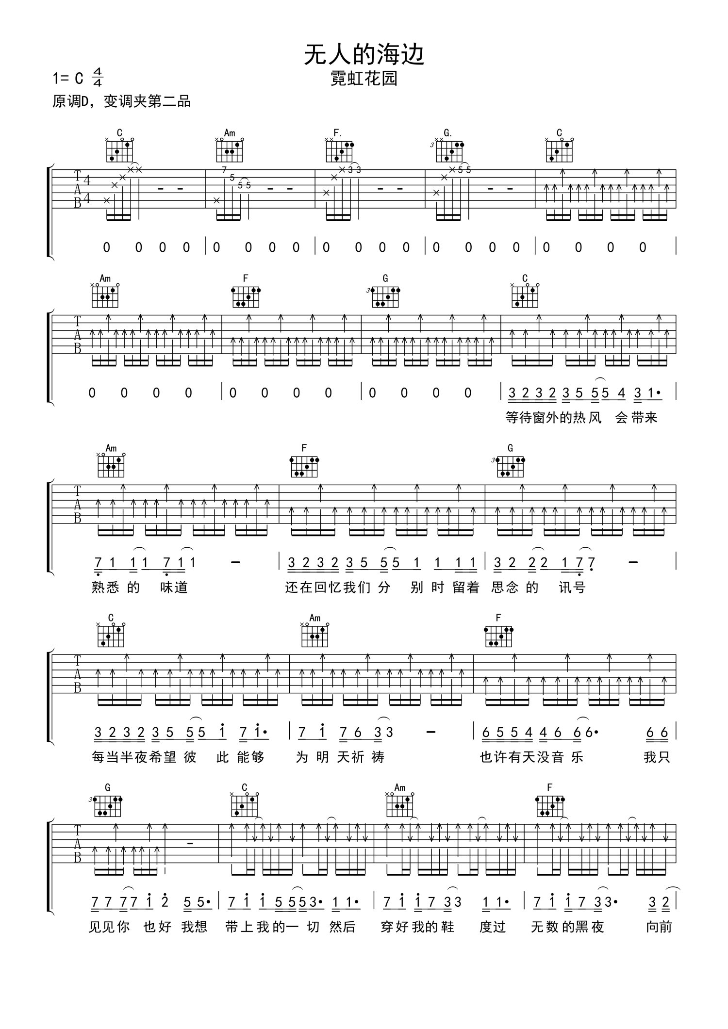 曲谱介绍: 霓虹花园《无人的海边》吉他谱_C调吉他弹唱谱