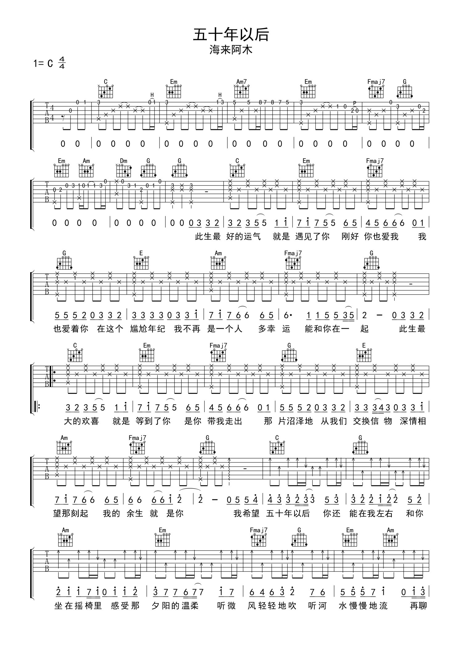 曲谱介绍: 海来阿木《五十年以后》吉他谱_C调吉他弹唱谱