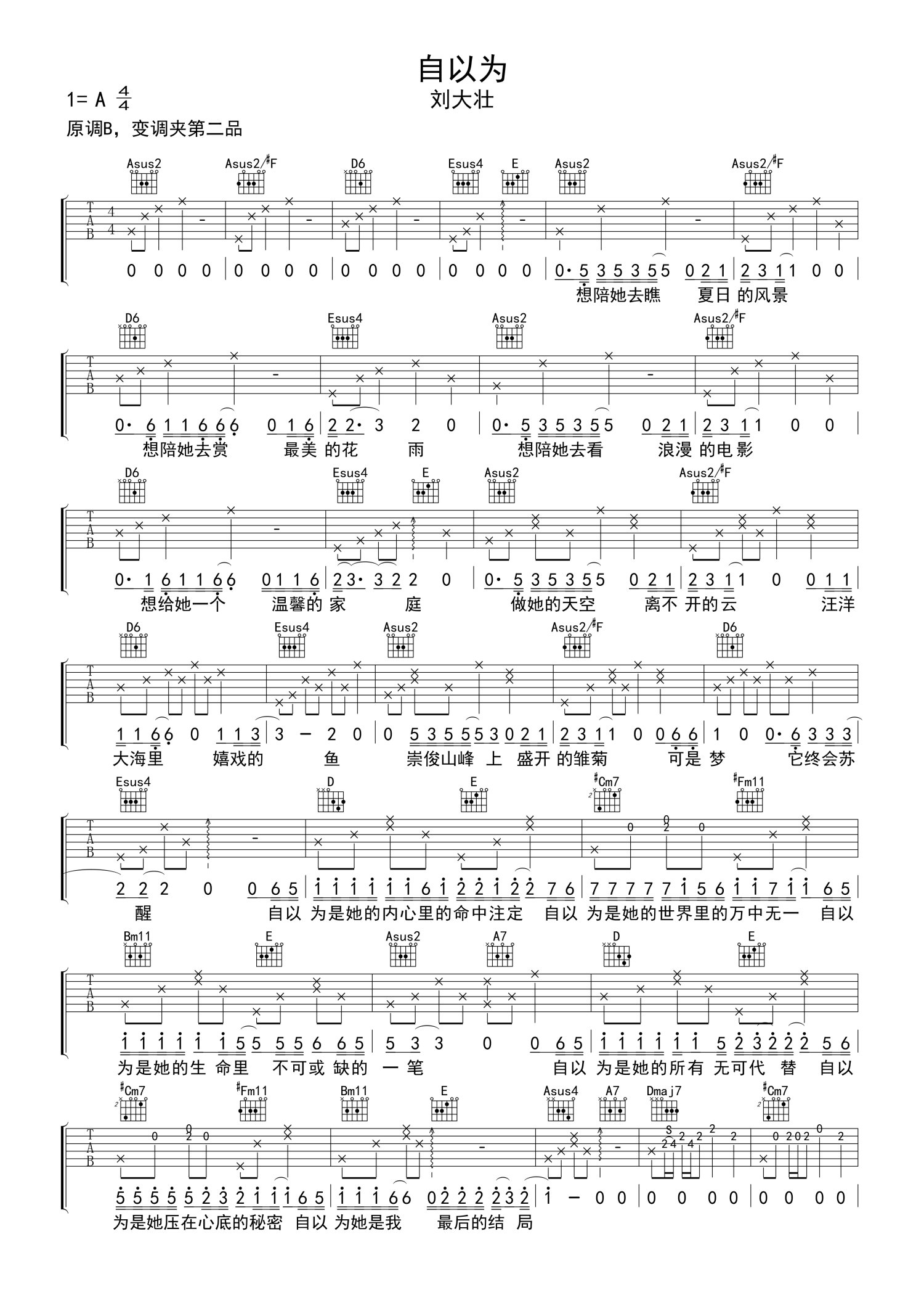 曲谱介绍: 刘大壮《自以为》吉他谱_A调吉他弹唱谱_免翻页版