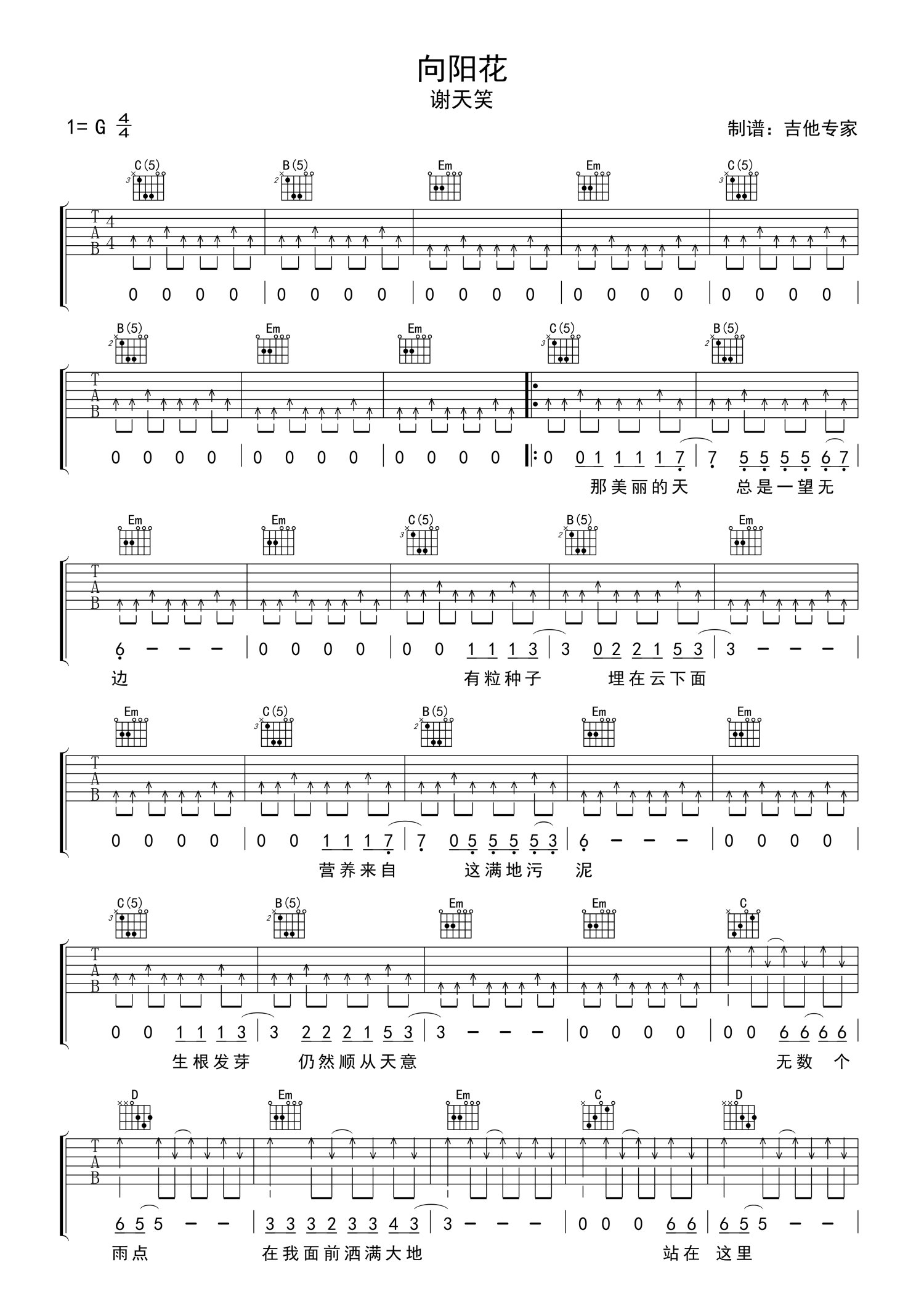 • 向阳花吉他谱 - 谢天笑 - G调吉他弹唱谱第1张