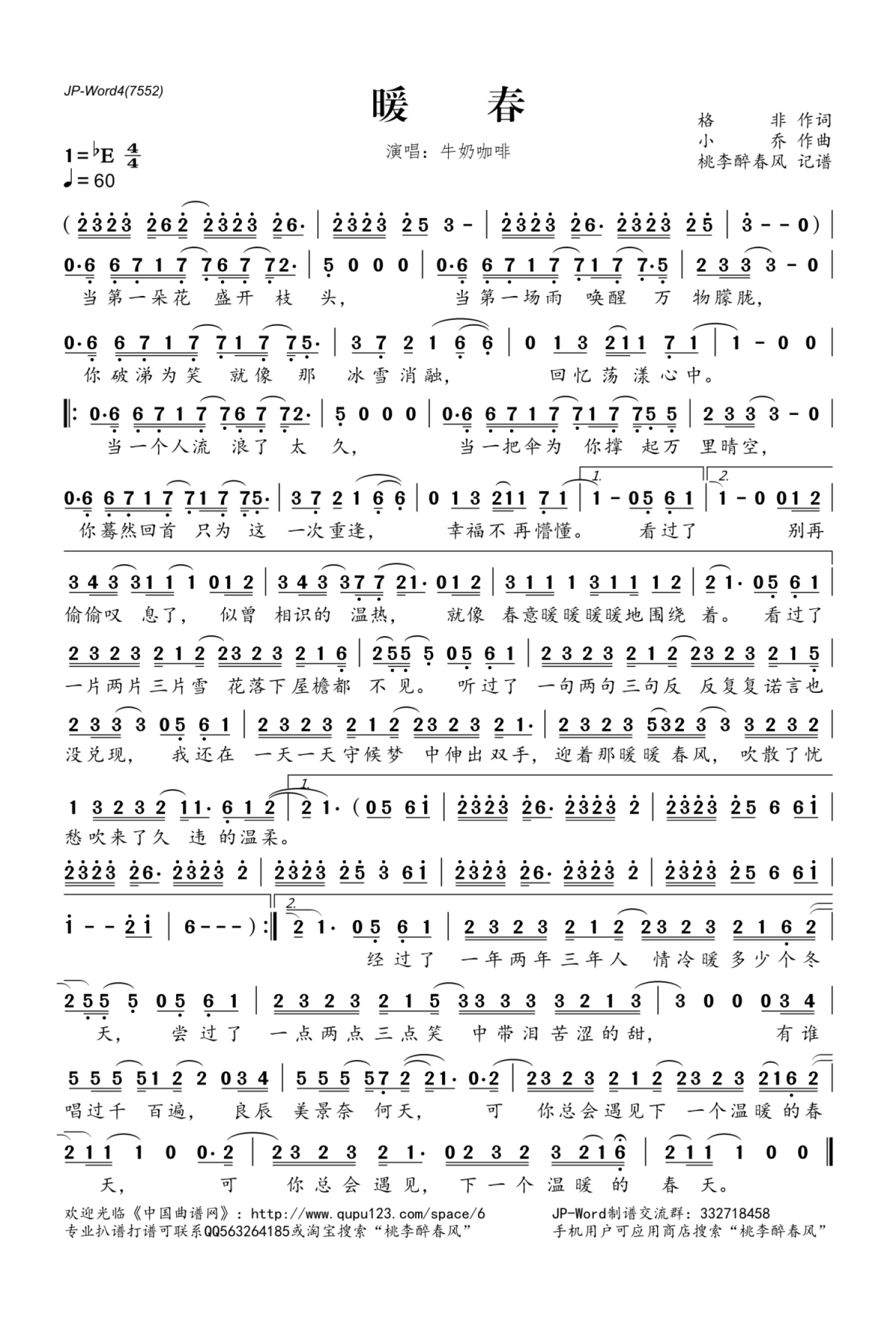 曲谱介绍: 牛奶咖啡《暖春》歌词_简谱