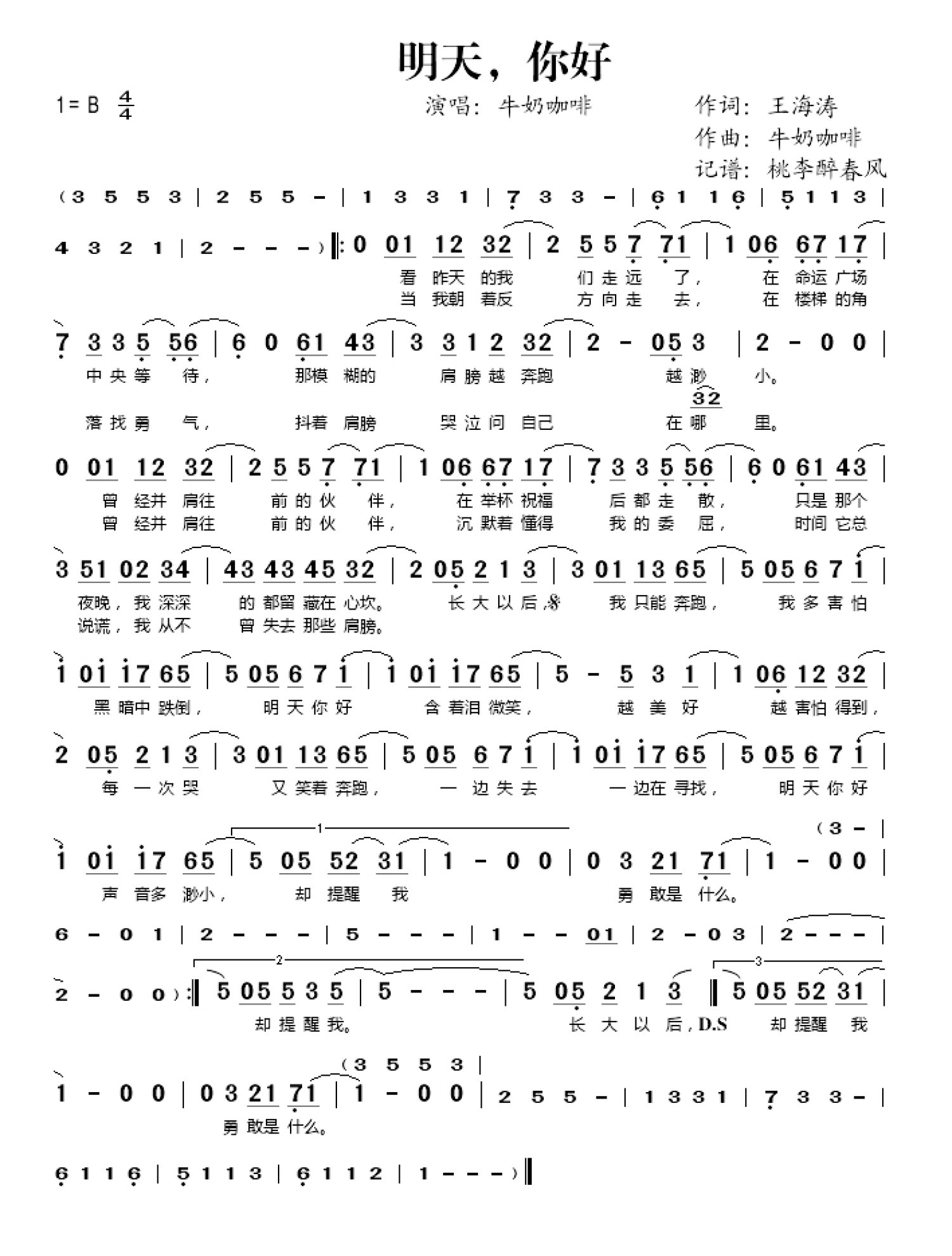 曲谱介绍: 牛奶咖啡《明天,你好》歌词_简谱