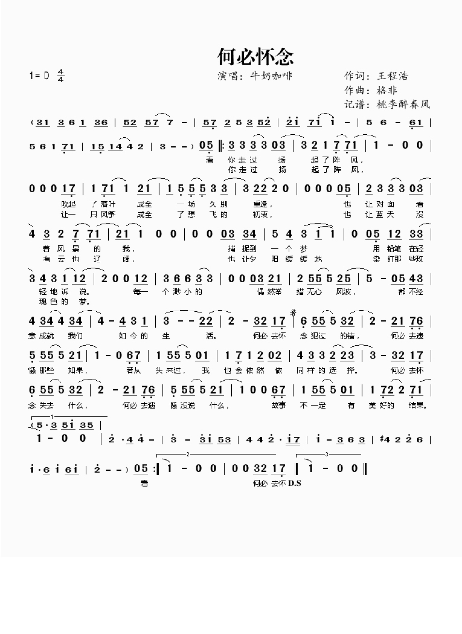 曲谱介绍: 牛奶咖啡《何必怀念》歌词_简谱