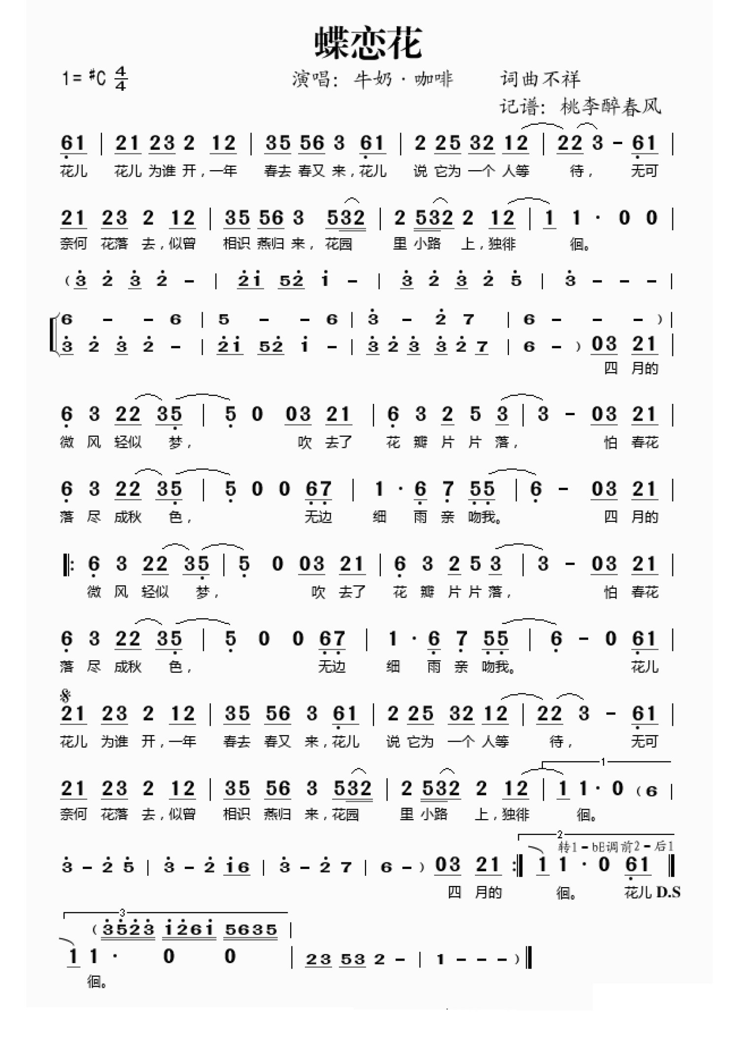 曲谱介绍: 牛奶咖啡《蝶恋花》歌词_简谱