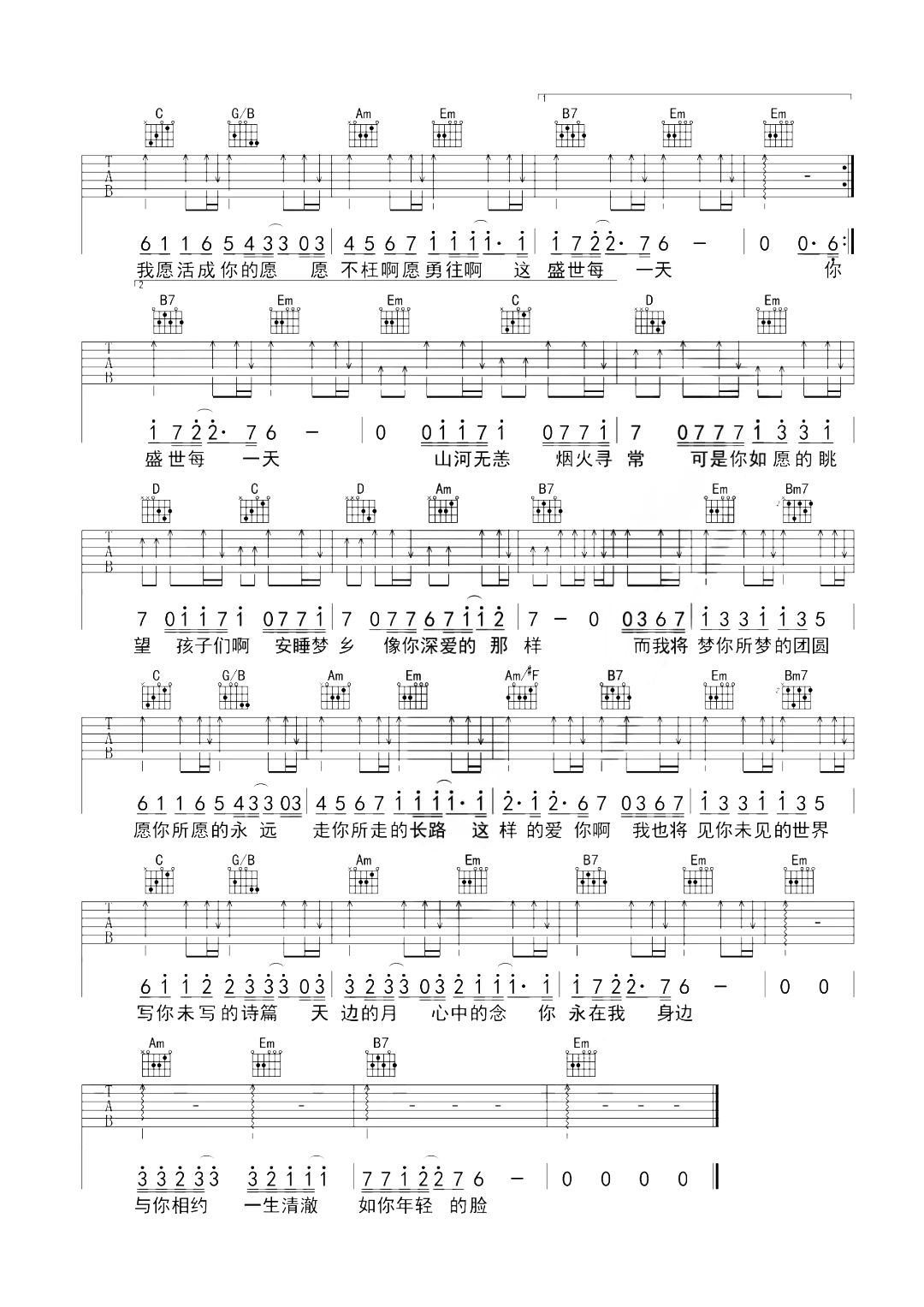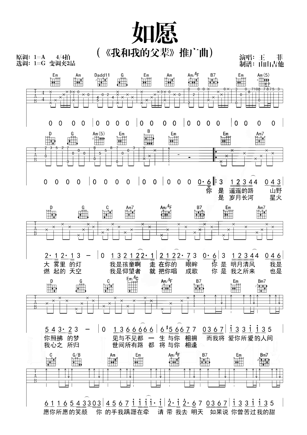 曲谱介绍: 王菲《如愿》吉他谱_G调吉他弹唱谱