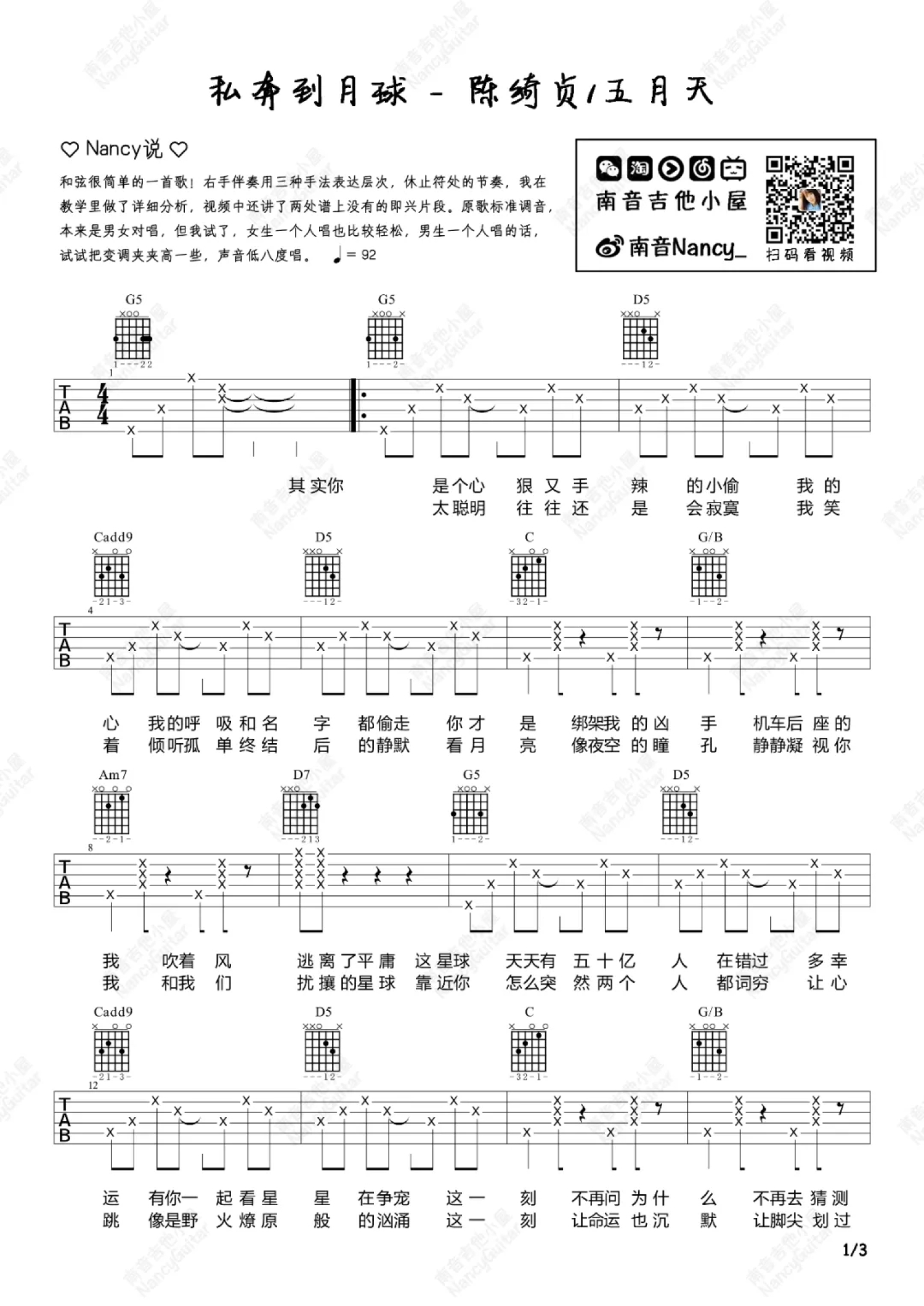 曲谱介绍: 五月天/陈绮贞《私奔到月球》吉他谱_G调吉他弹唱谱
