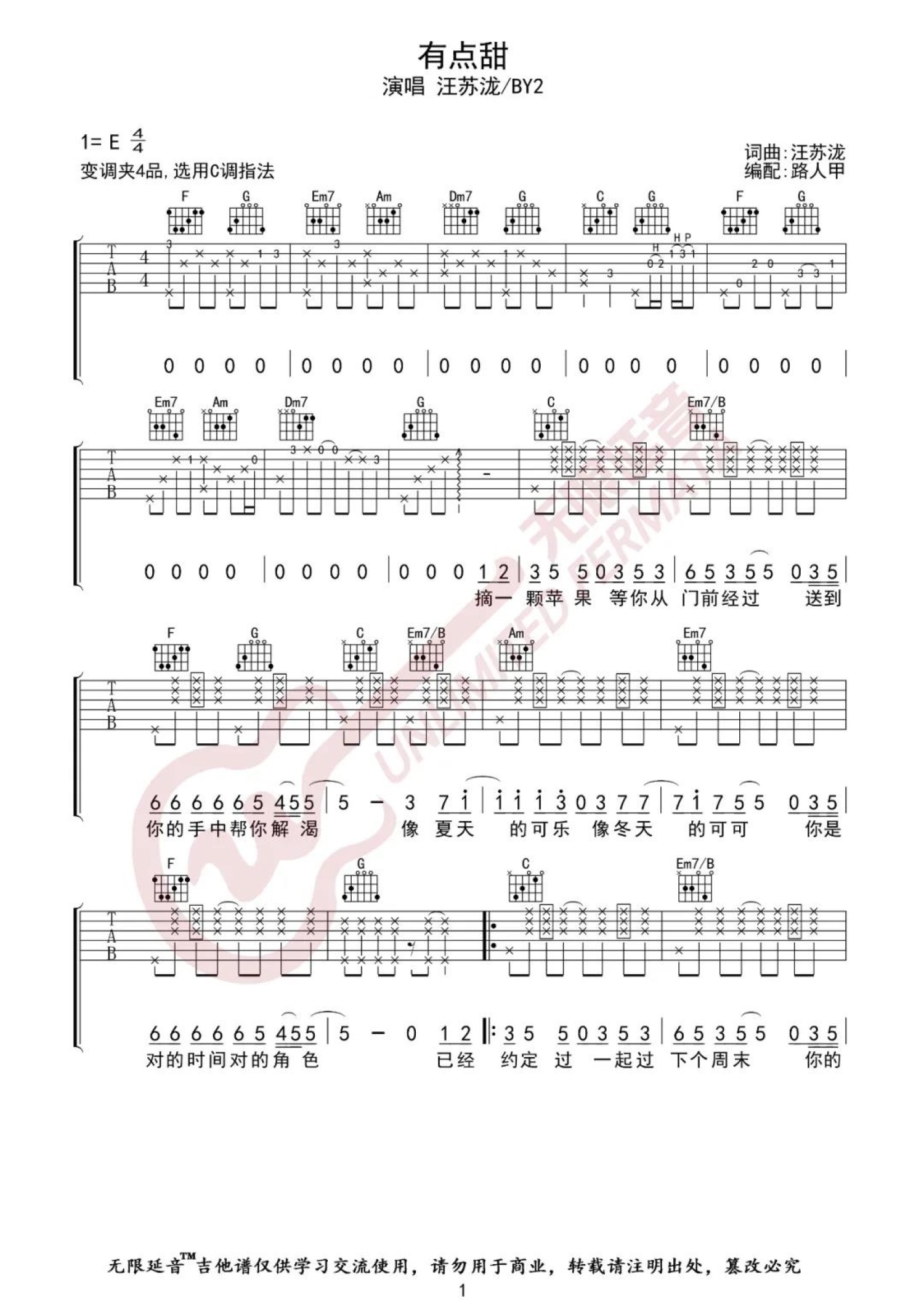 曲谱介绍: 汪苏泷/BY2《有点甜》吉他谱_C调吉他弹唱谱