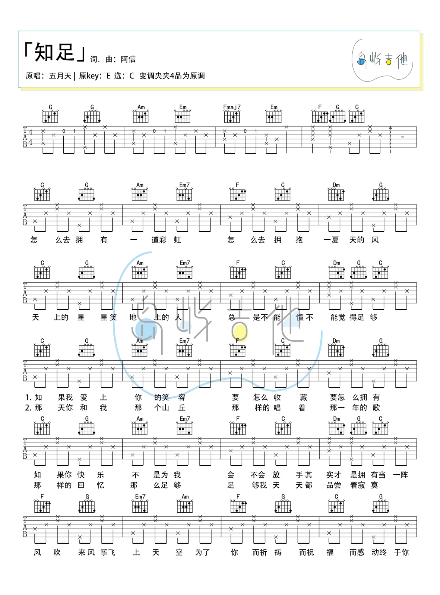 曲谱介绍: 五月天《知足》吉他谱_C调吉他弹唱谱
