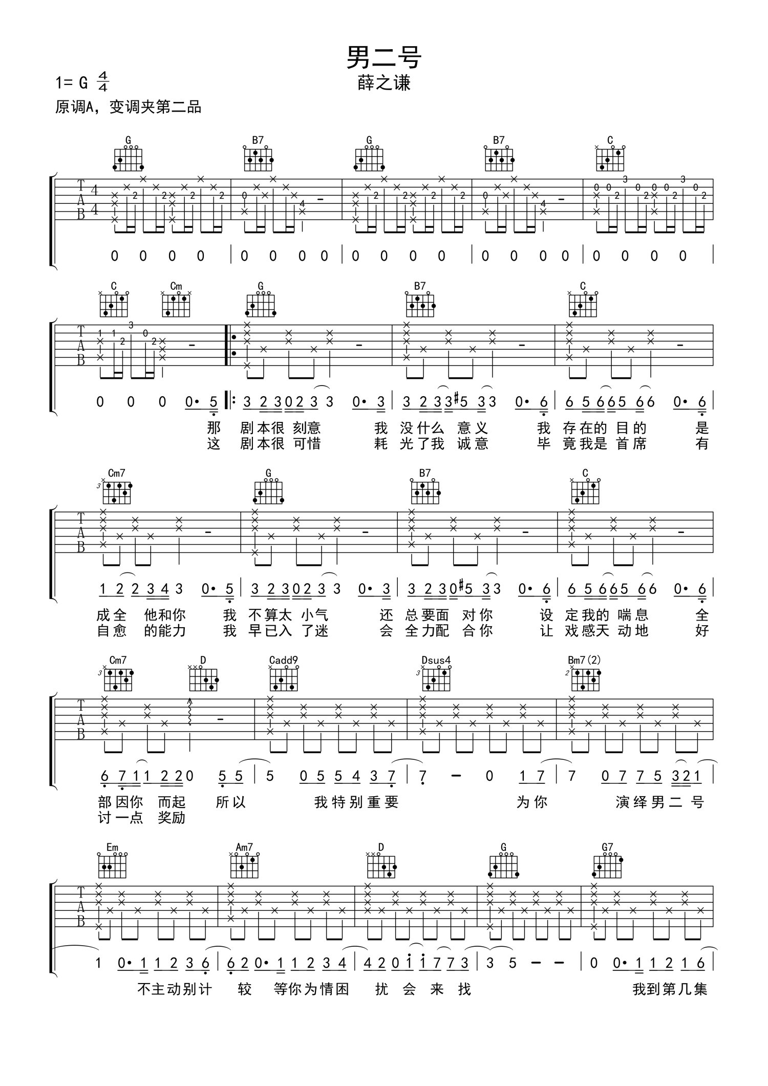 男二号吉他谱 - 薛之谦 - G调吉他弹唱谱