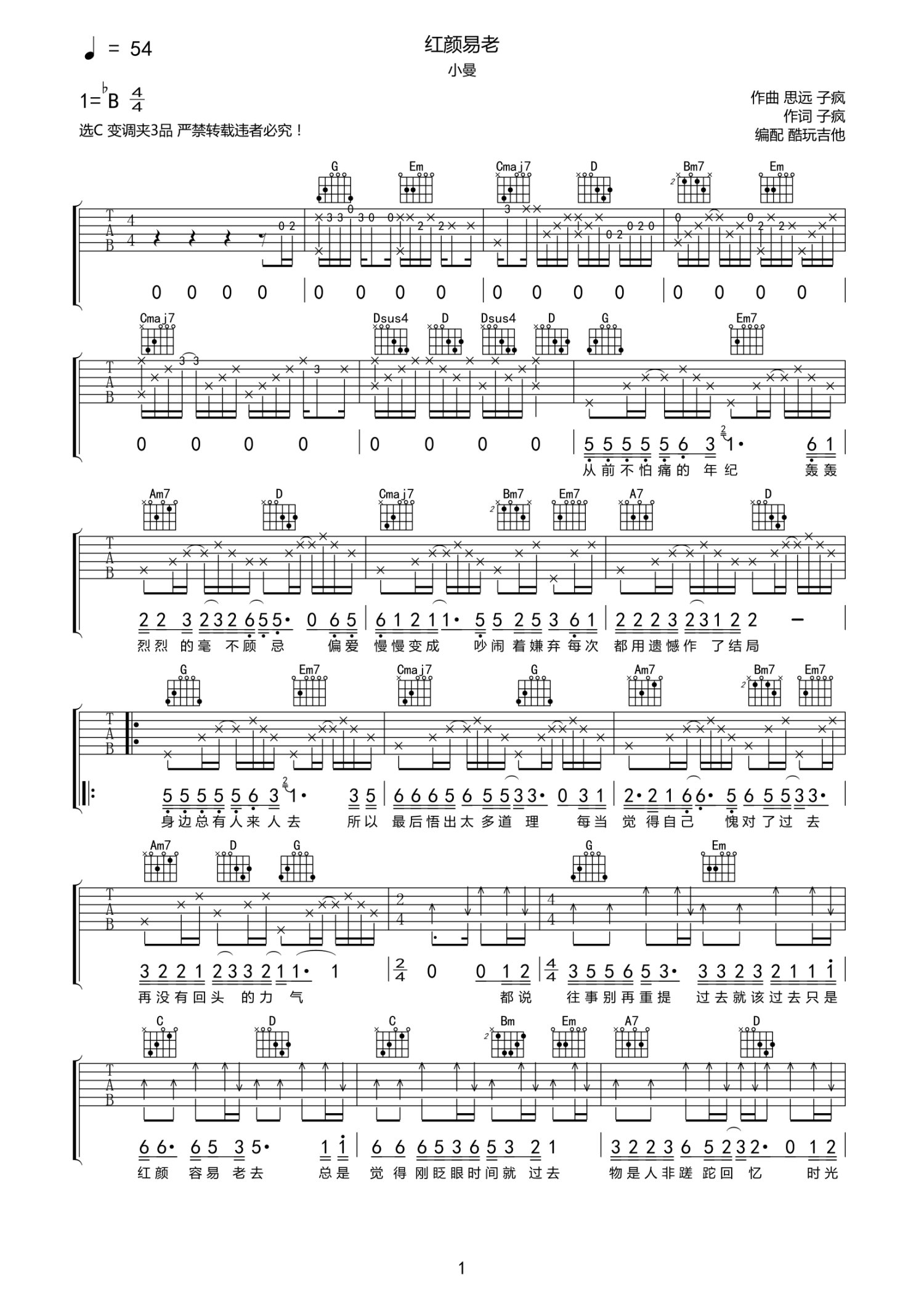 曲谱介绍: 小曼《红颜易老》吉他谱-G调弹唱谱高清完整原版