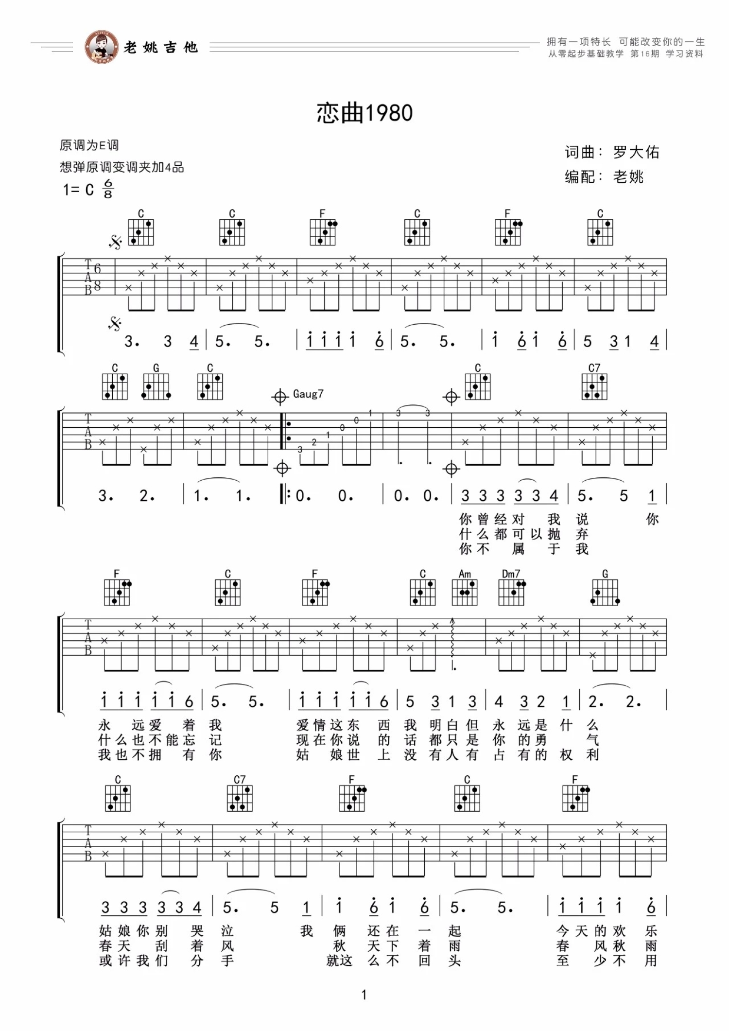曲谱介绍: 罗大佑《恋曲1980》吉他谱_C调吉他弹唱谱