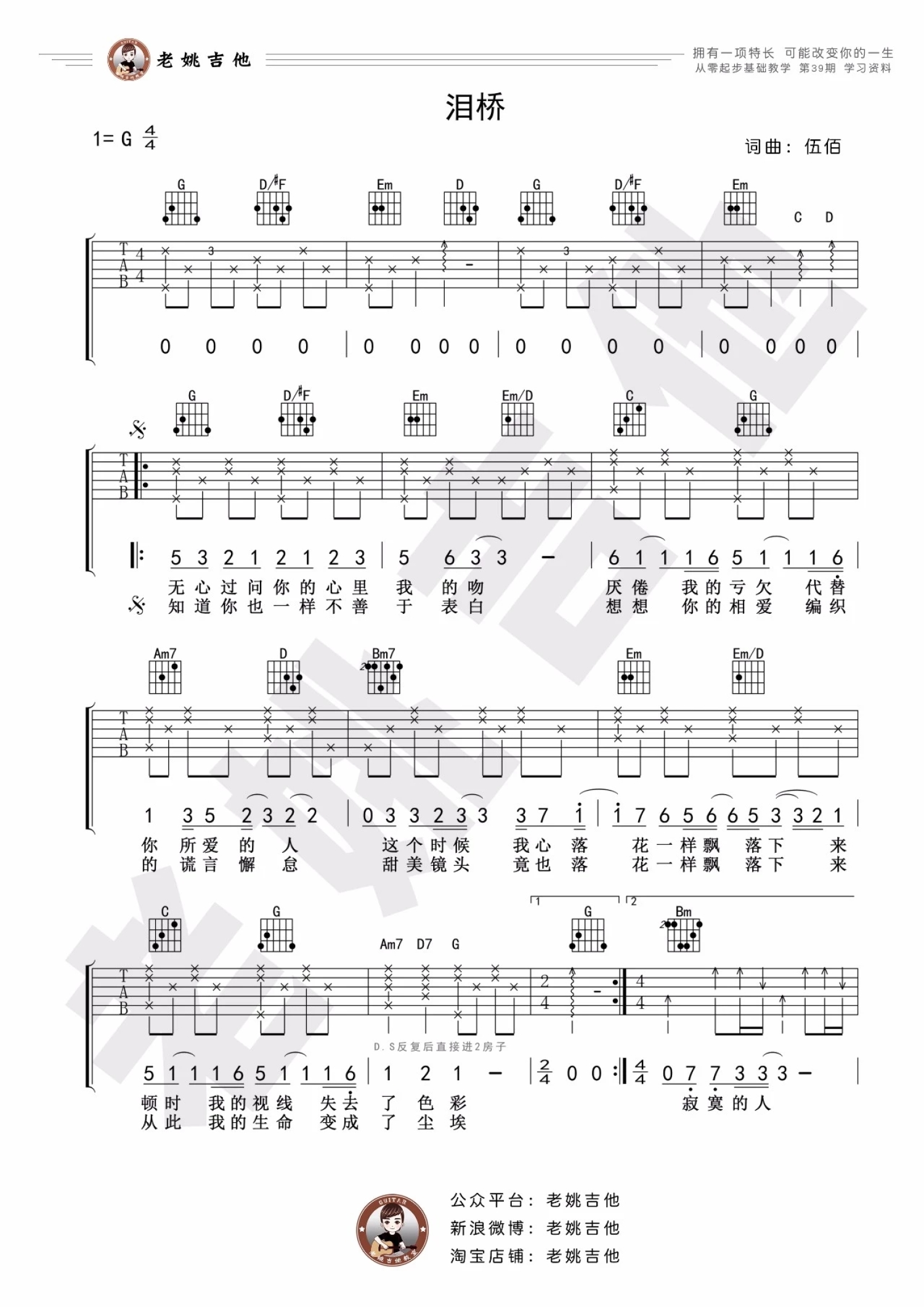 曲谱介绍: 伍佰《泪桥》吉他谱_G调吉他弹唱谱