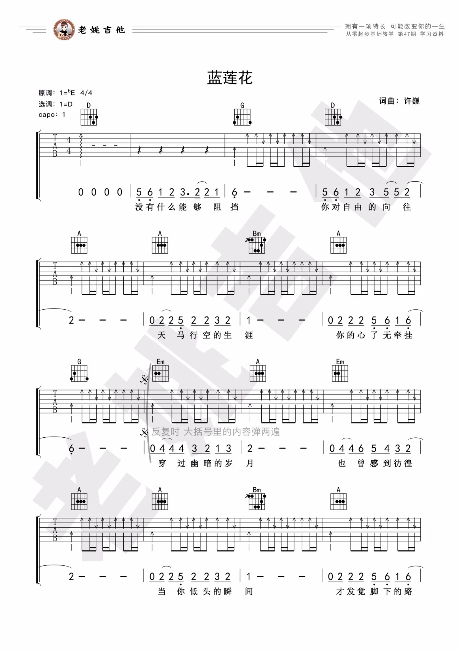 曲谱介绍: 许巍《蓝莲花》吉他谱_D调吉他弹唱谱