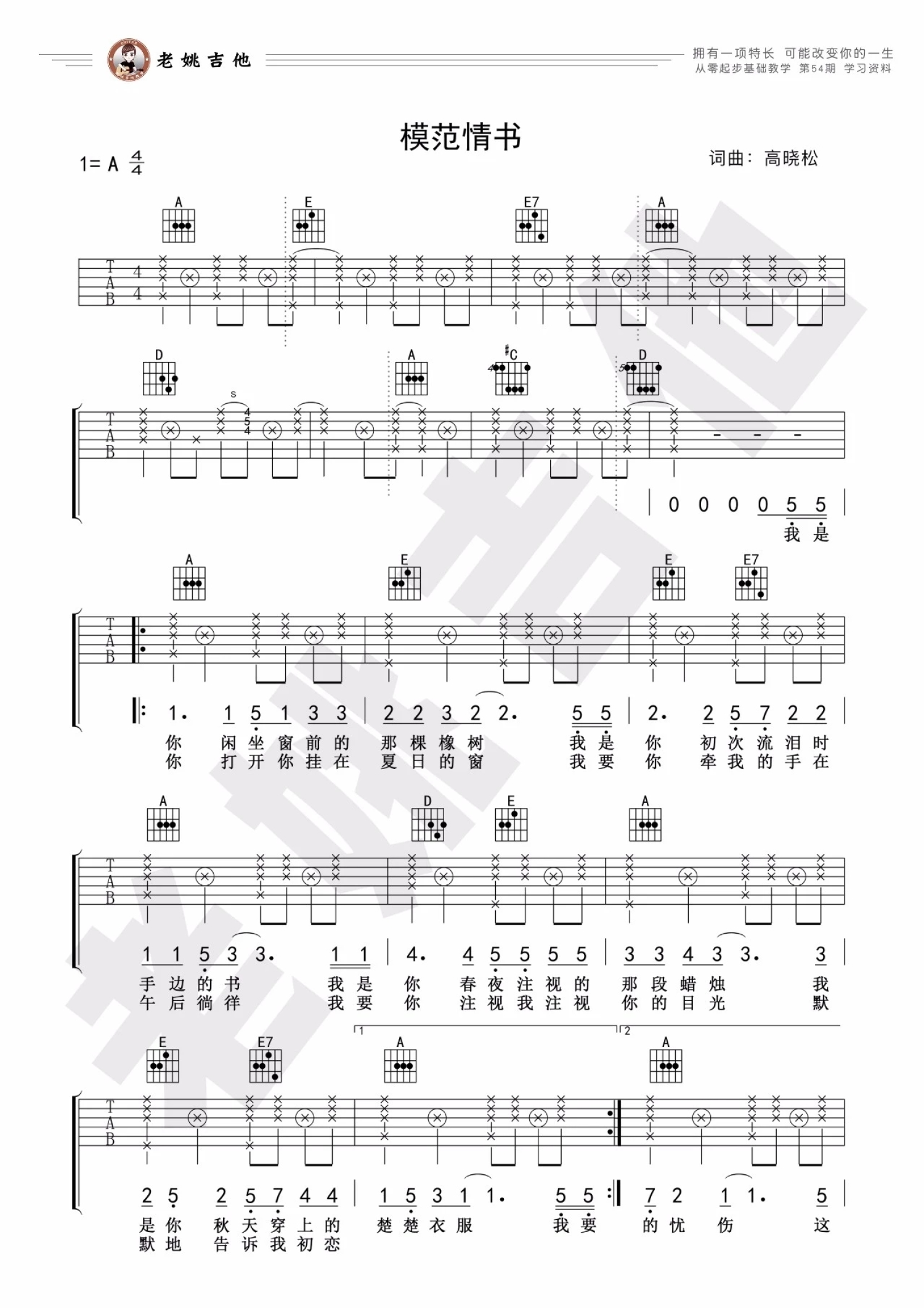 曲谱介绍: 老狼《模范情书》吉他谱_A调吉他弹唱谱