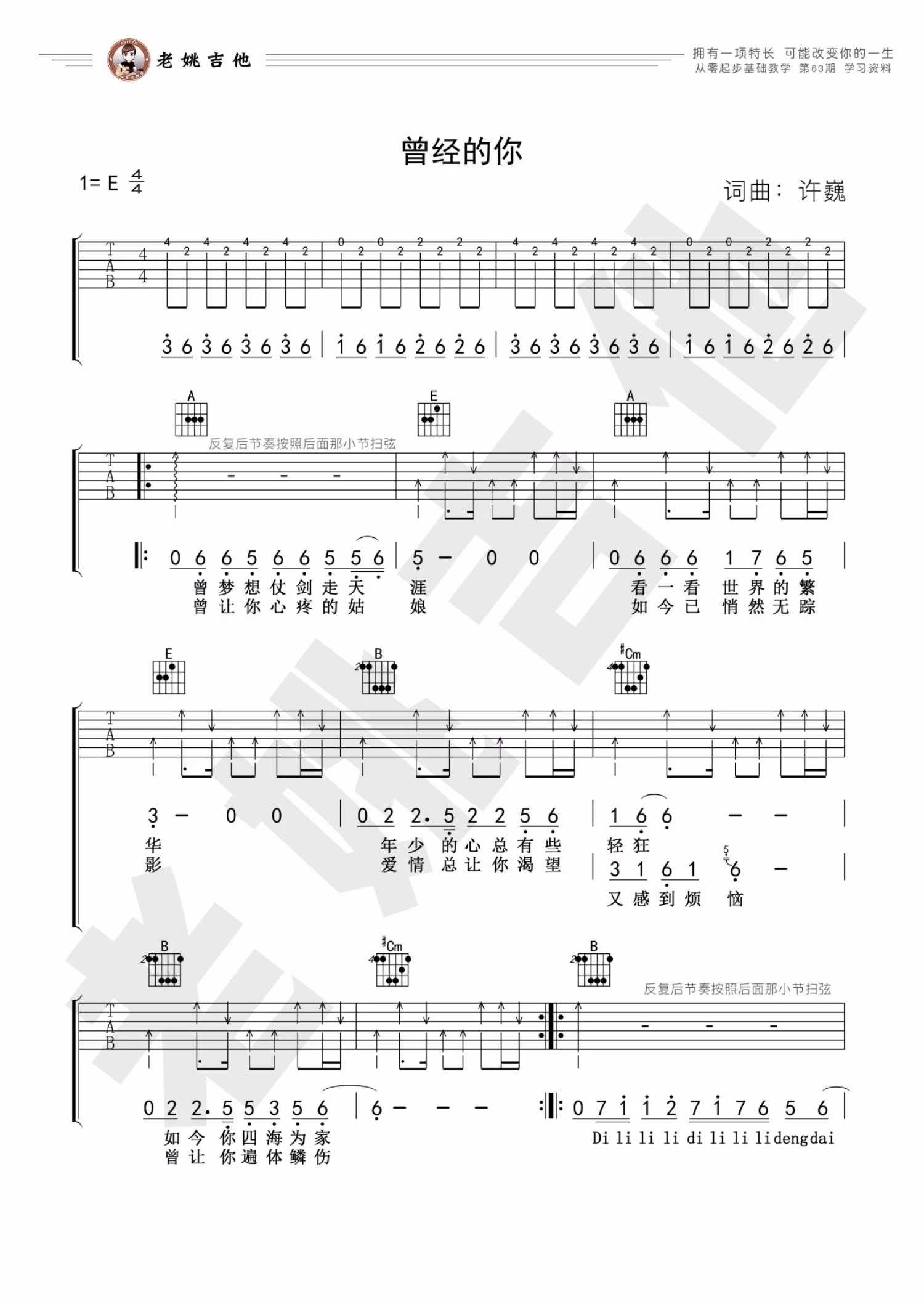 曲谱介绍: 许巍《曾经的你》吉他谱_E调吉他弹唱谱