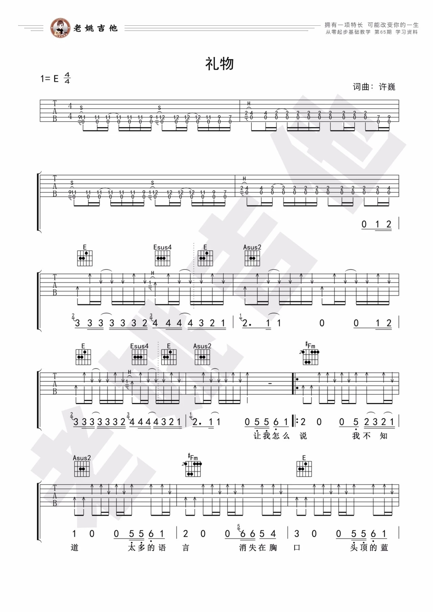 曲谱介绍: 许巍《礼物》吉他谱_E调吉他弹唱谱
