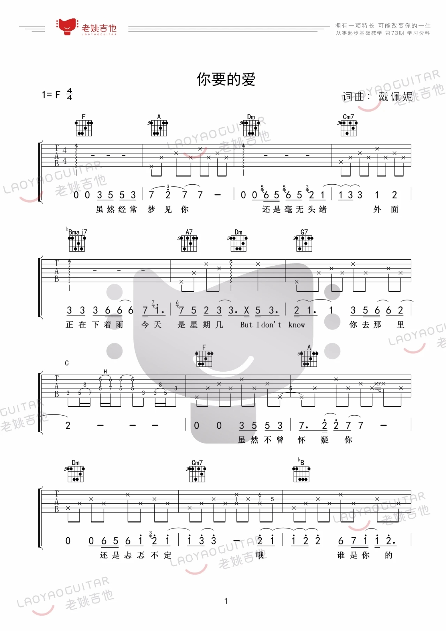 曲谱介绍: 戴佩妮《你要的爱》吉他谱_F调吉他弹唱谱