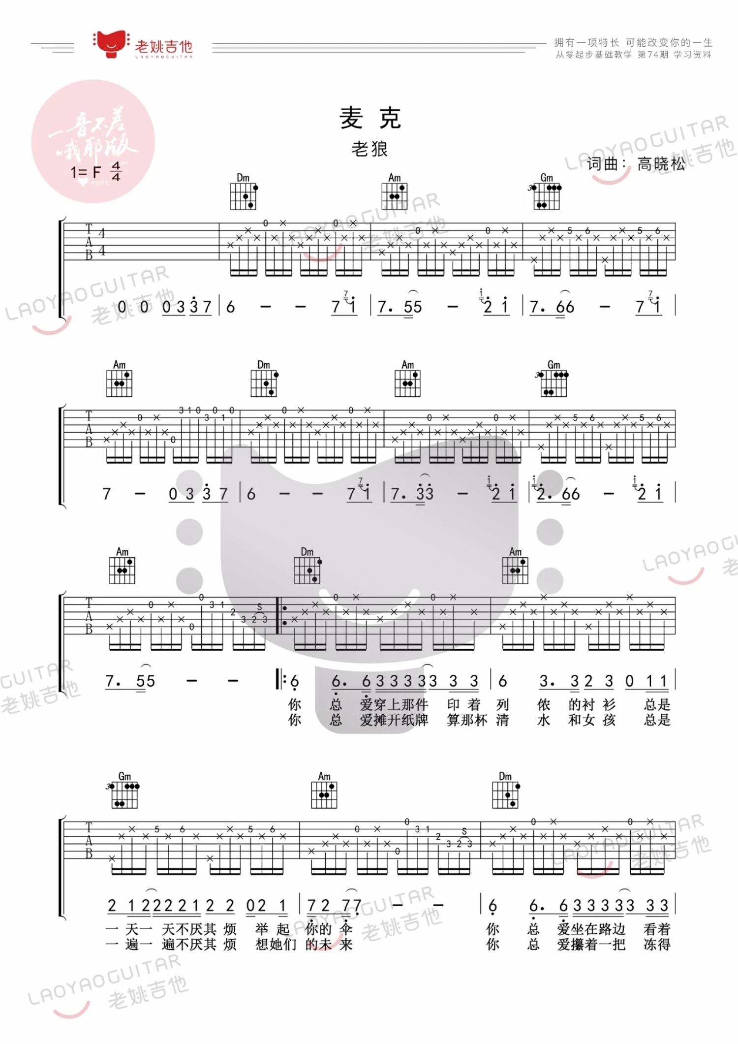 曲谱介绍: 老狼《麦克》吉他谱_F调吉他弹唱谱