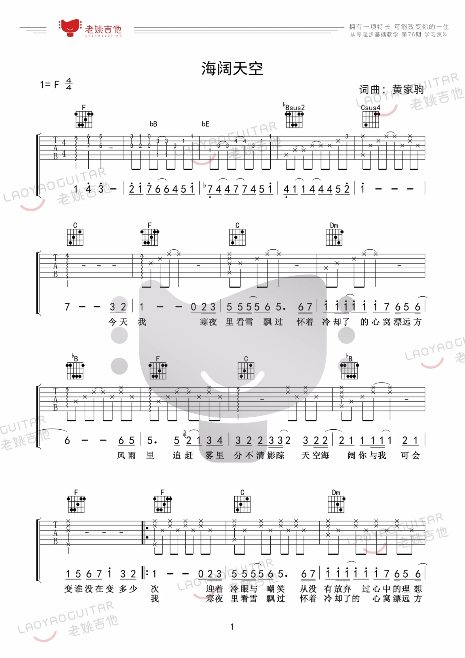 曲谱介绍: Beyond《海阔天空》吉他谱_F调吉他弹唱谱