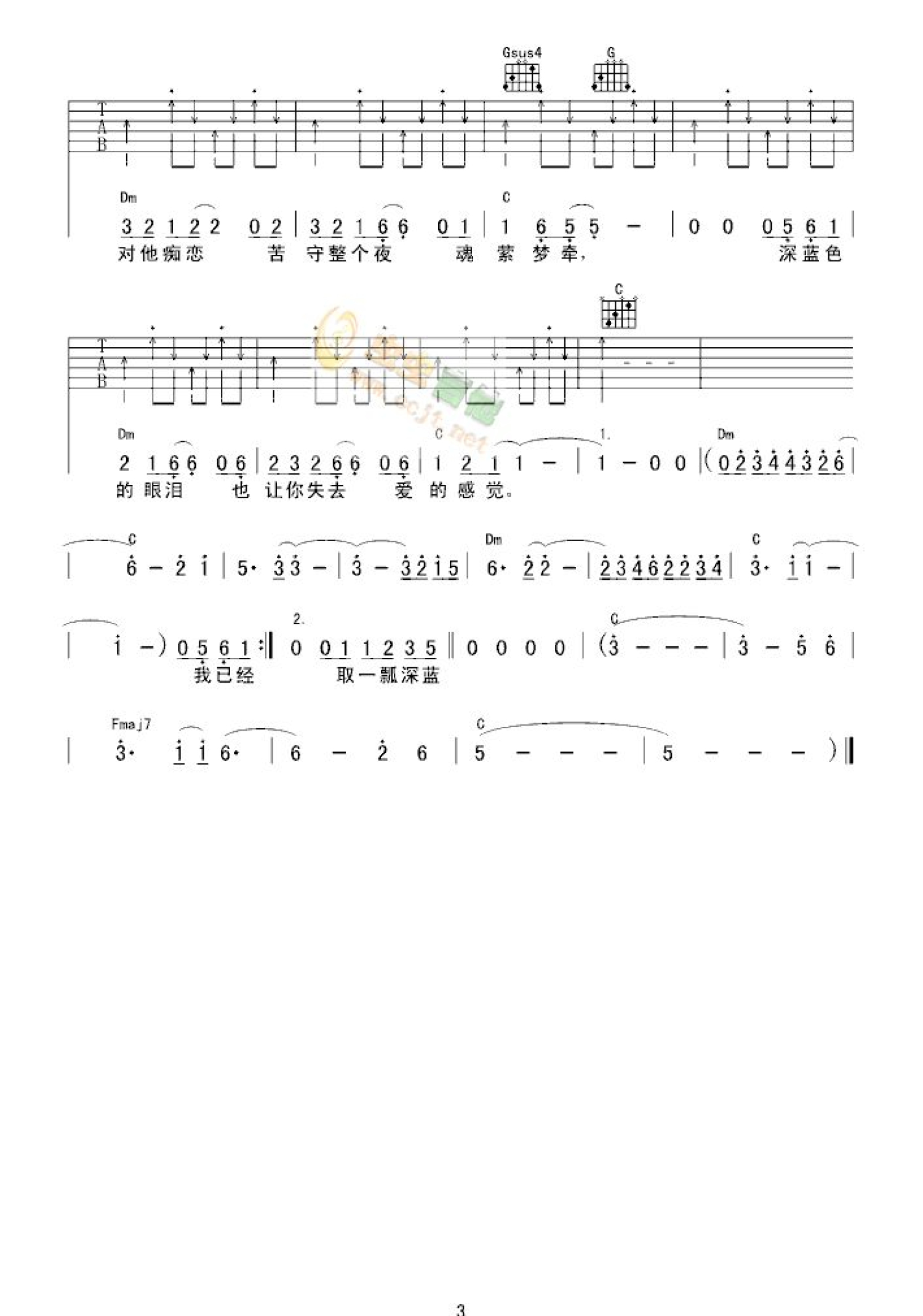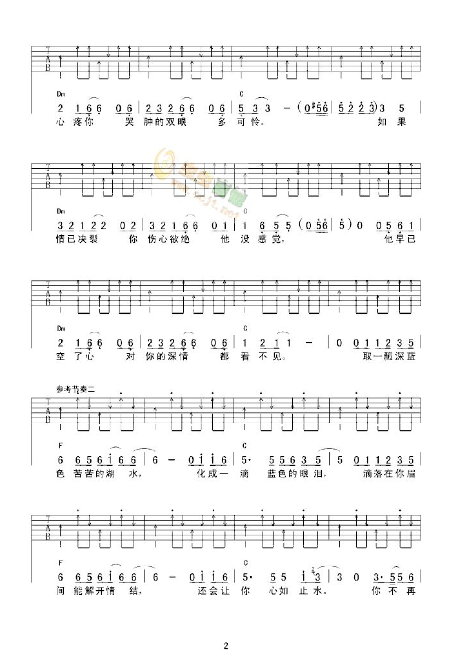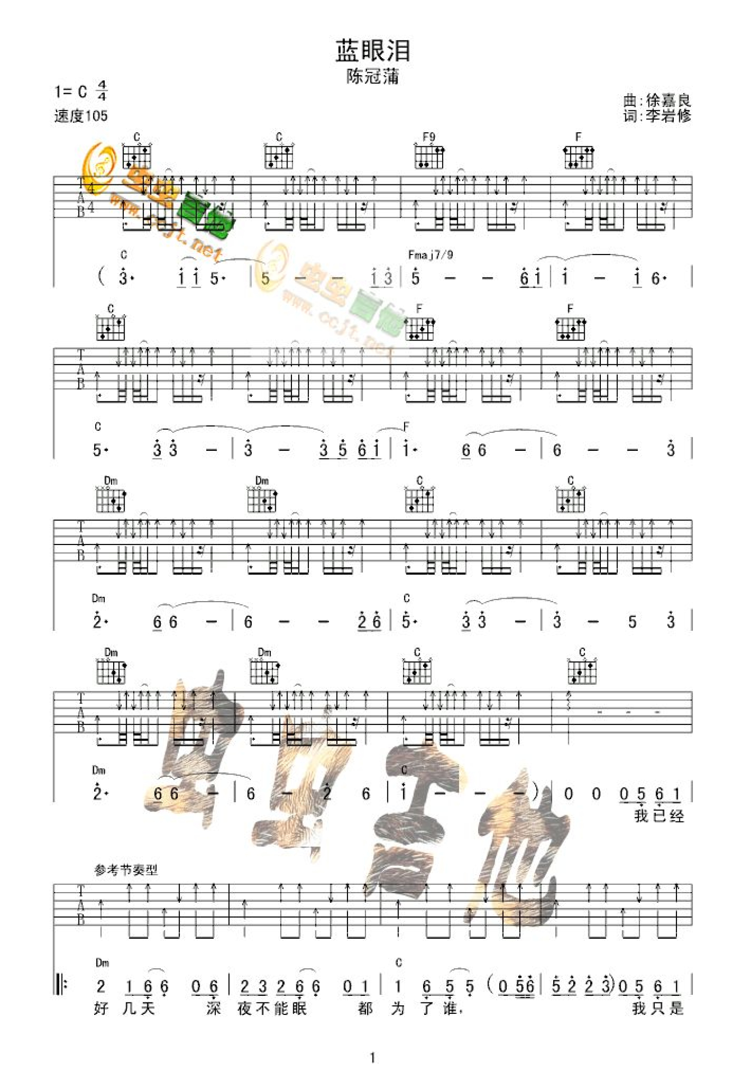 曲谱介绍: 陈冠蒲《蓝眼泪》吉他谱_C调吉他弹唱谱