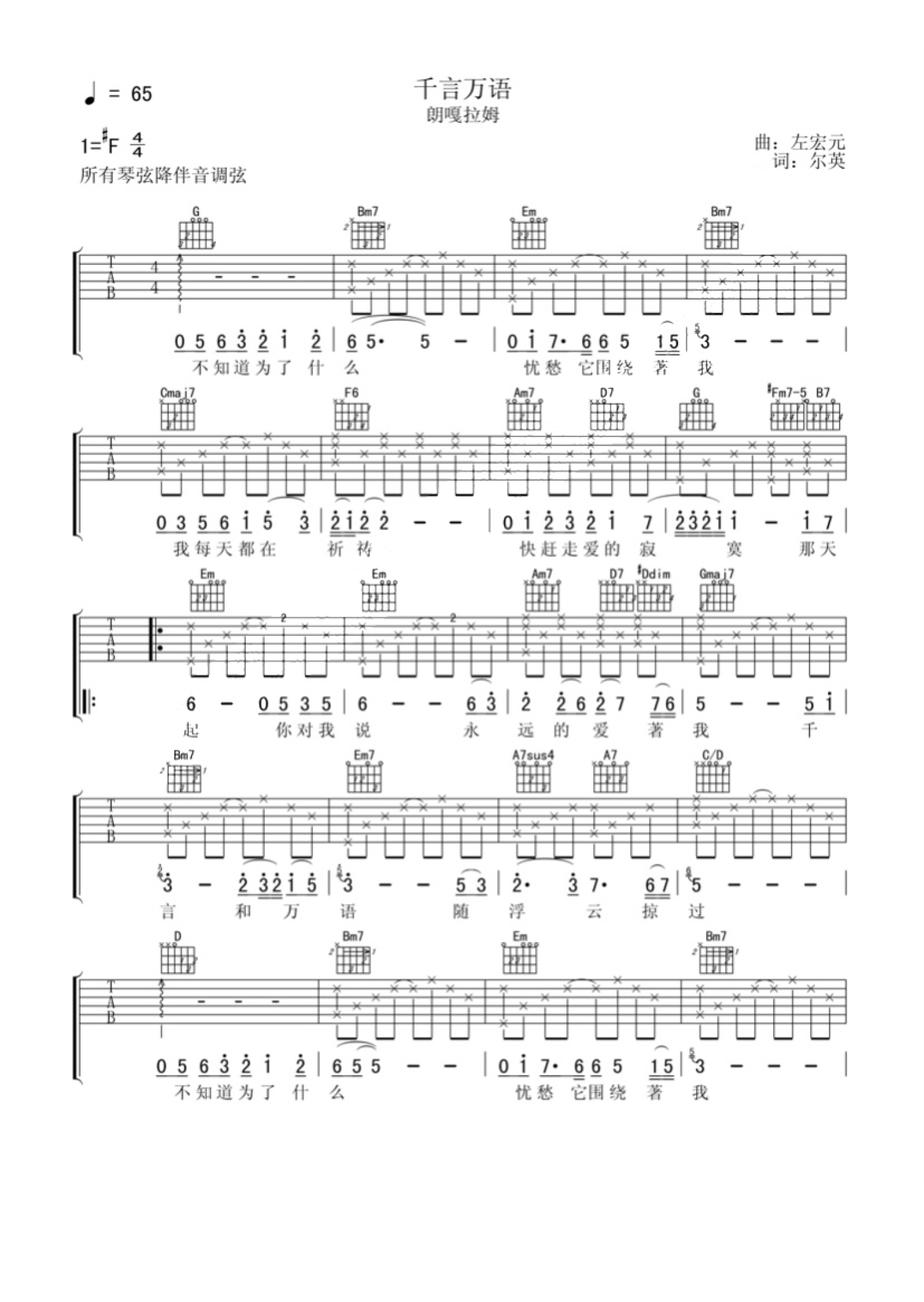 曲谱介绍: 邓丽君《千言万语》吉他谱_G调吉他弹唱谱