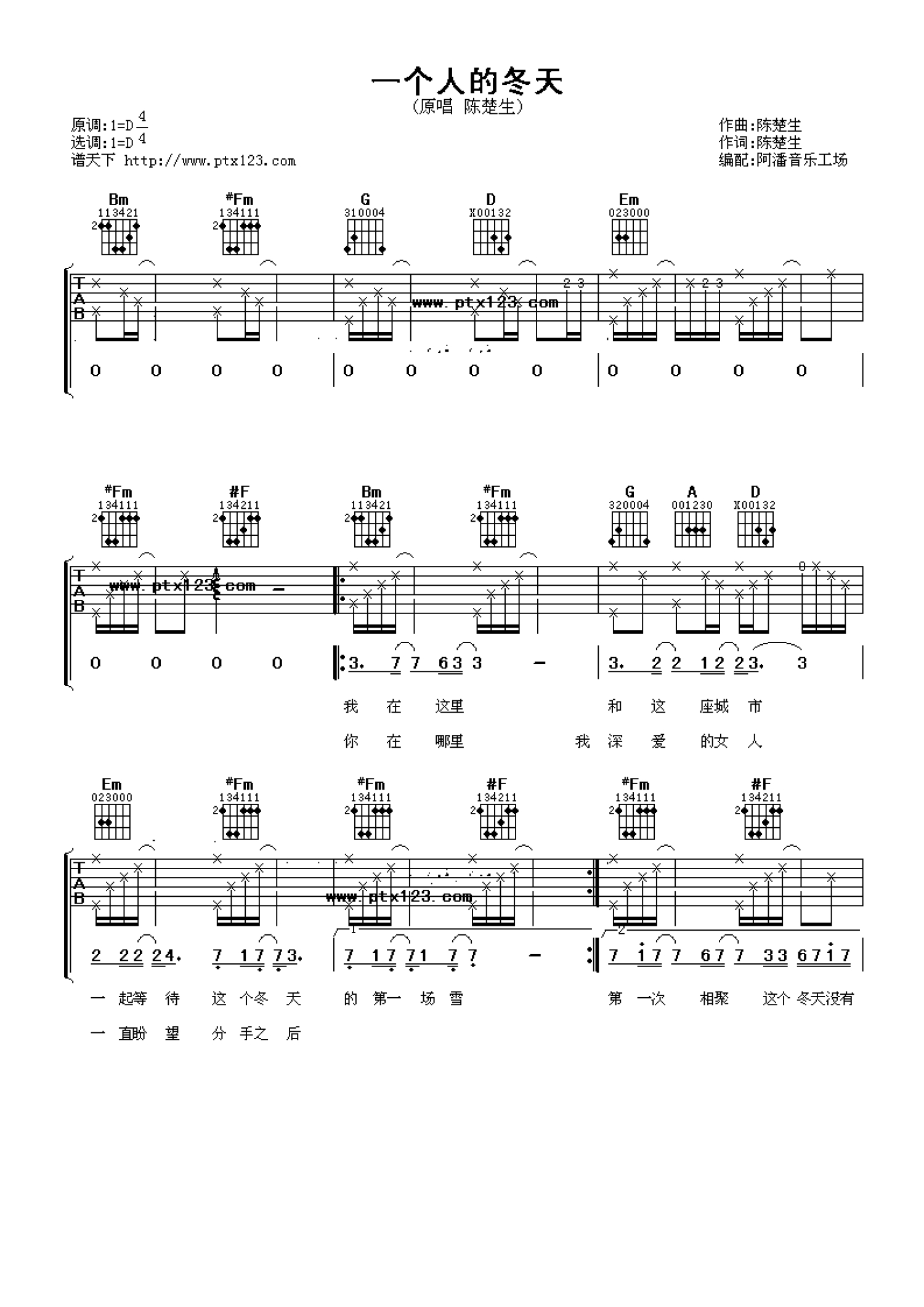 一个人的冬天吉他谱 - 陈楚生 - D调吉他弹唱谱