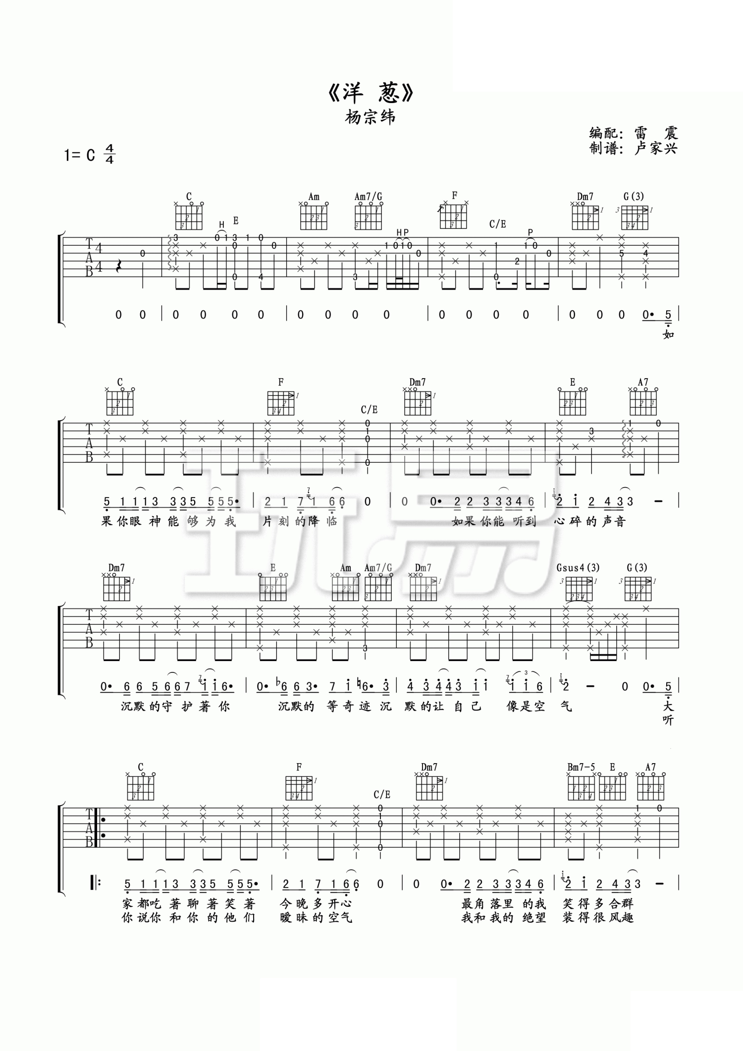 曲谱介绍: 杨宗纬《洋葱》吉他谱_C调吉他弹唱谱