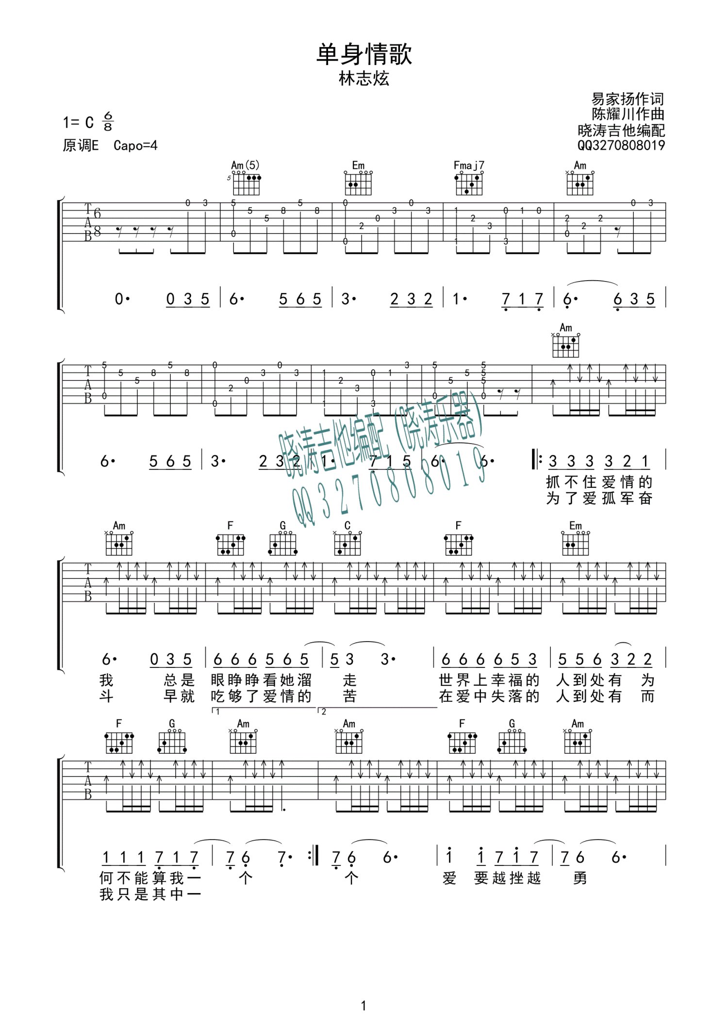 曲谱介绍: 林志炫《单身情歌》吉他谱_C调吉他弹唱谱