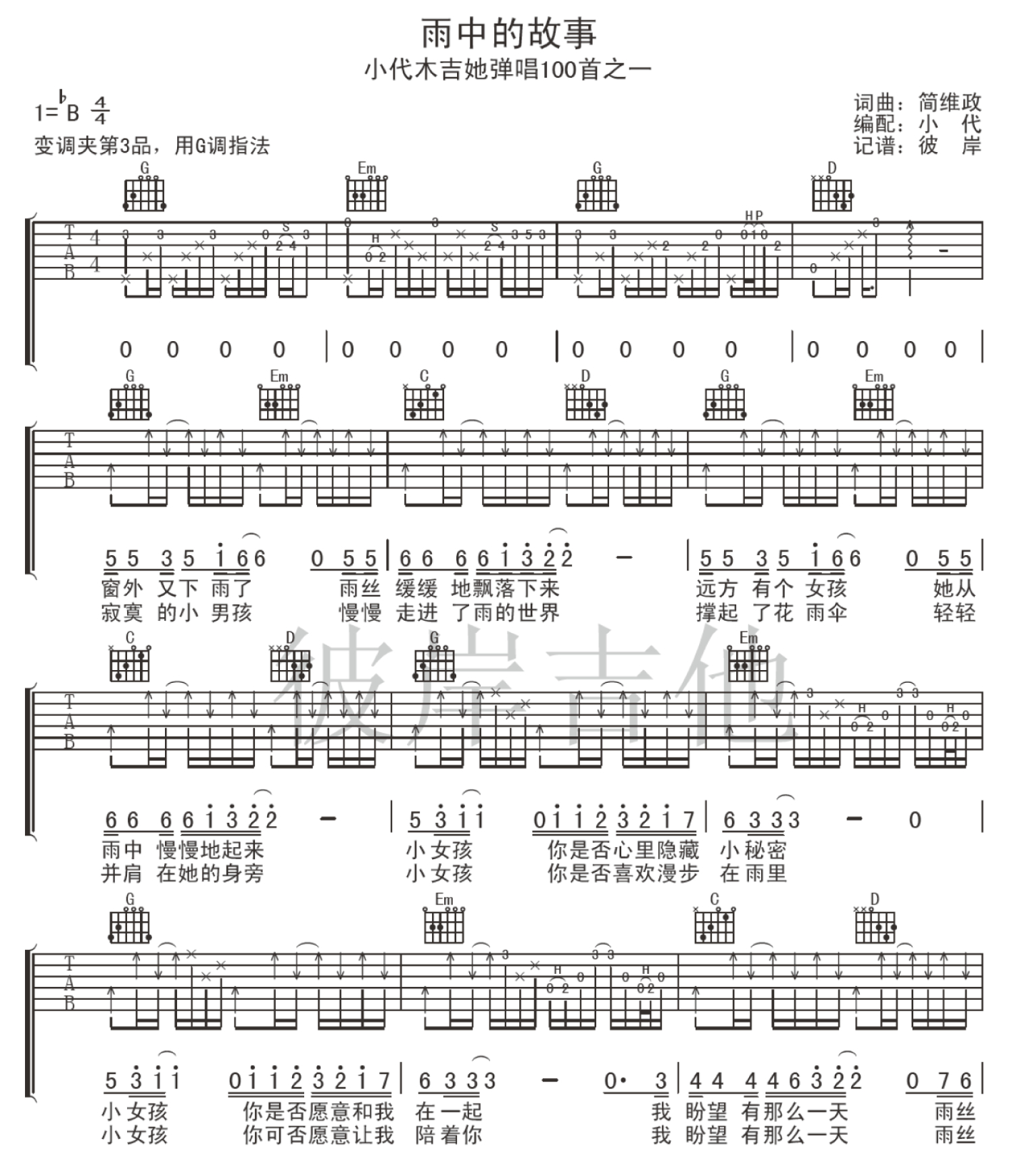 曲谱介绍: 刘文正 雨中的故事吉他谱 G调木吉她小代版