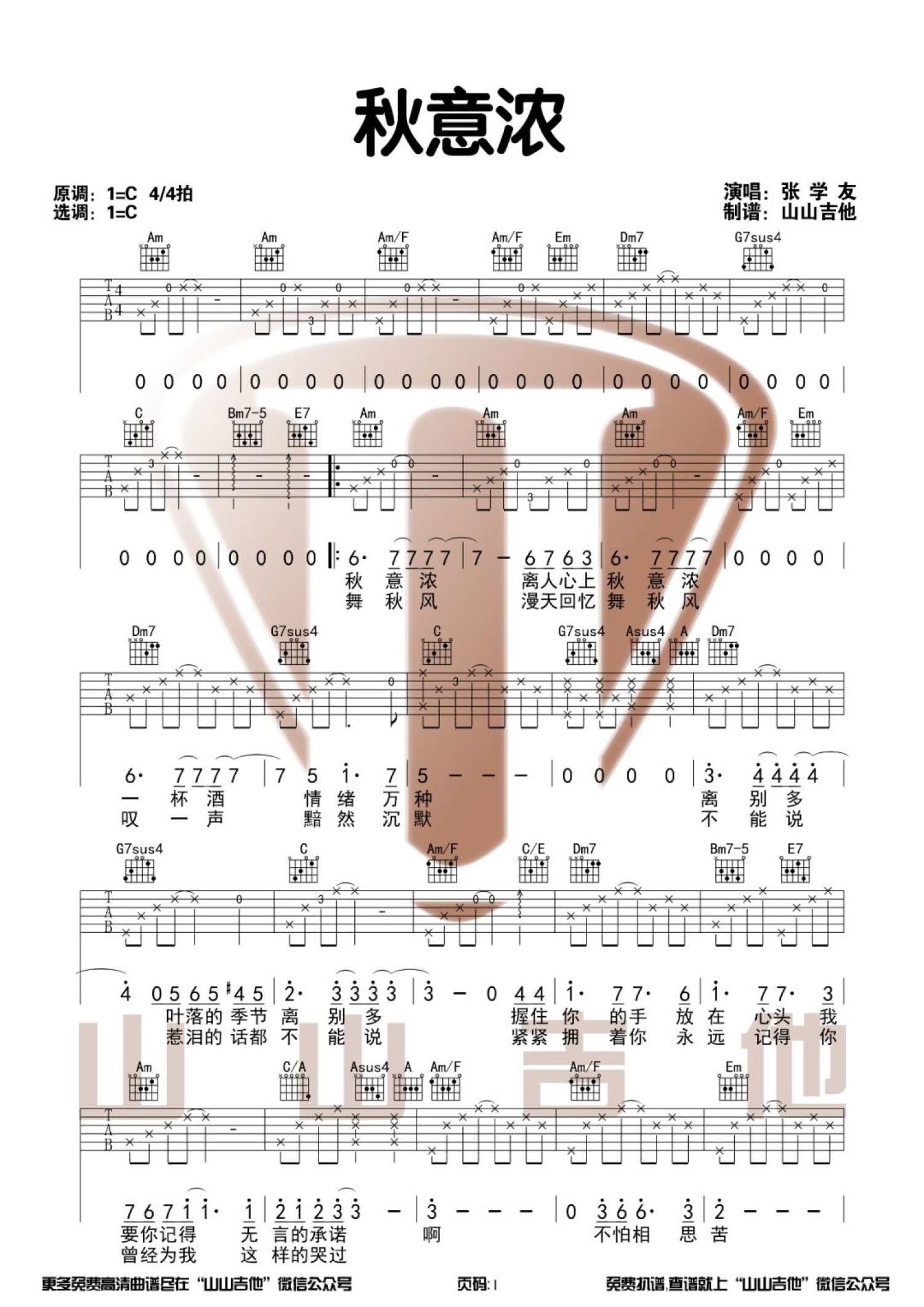 曲谱介绍: 张学友《秋意浓》吉他谱_C调吉他弹唱谱