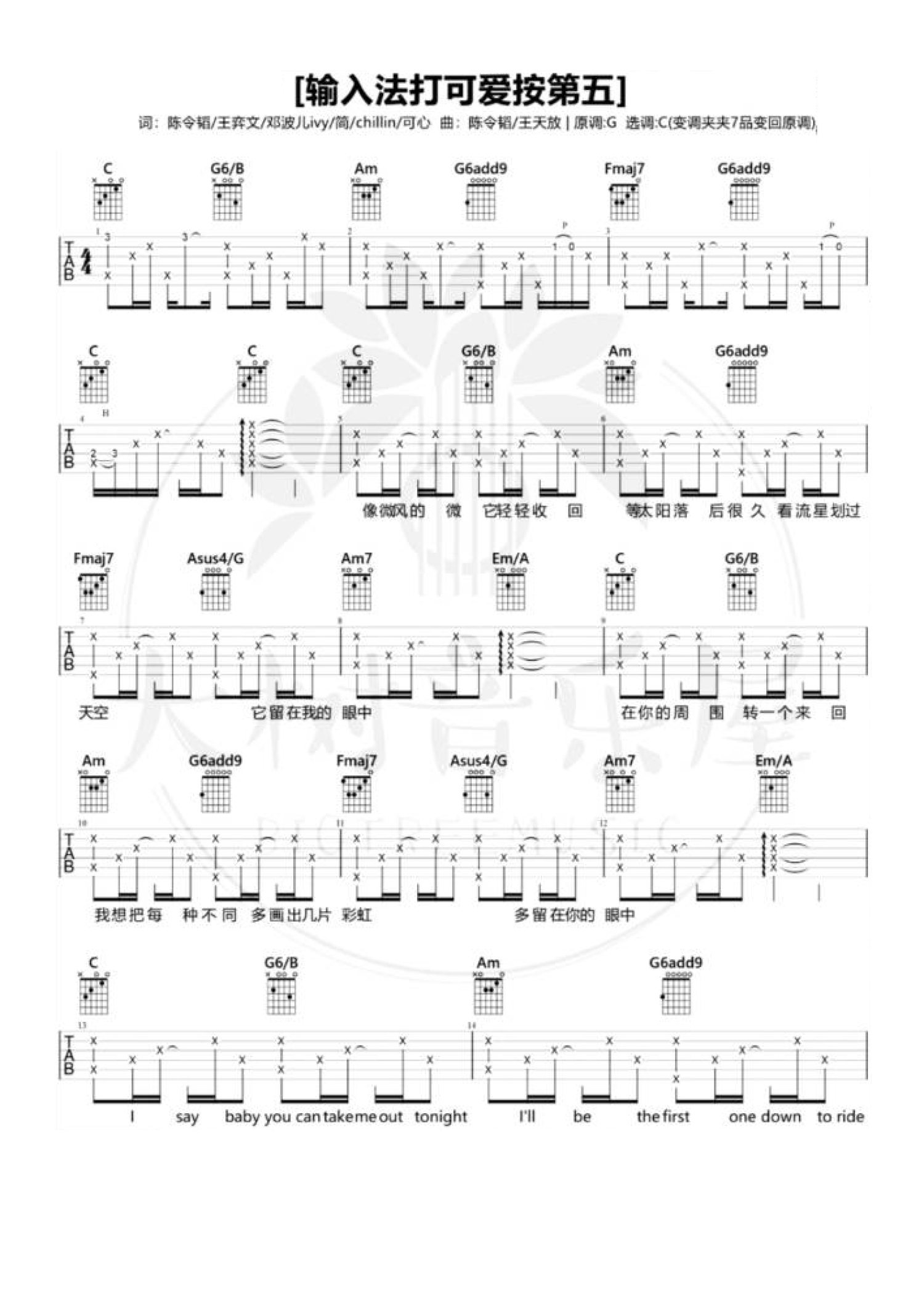 曲谱介绍: 米卡/鞠婧祎《输入法打可爱按第五》吉他谱_C调吉他弹唱谱