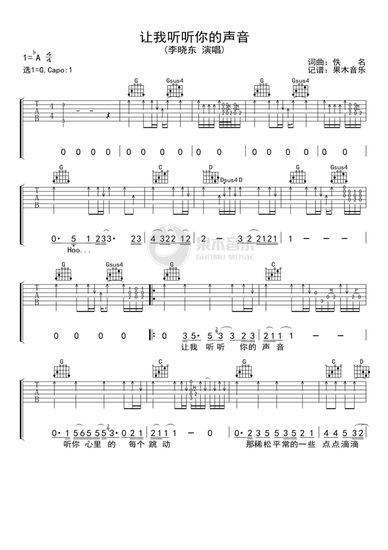 曲谱介绍: 李晓东《让我听听你的声音》吉他谱_G调吉他弹唱谱
