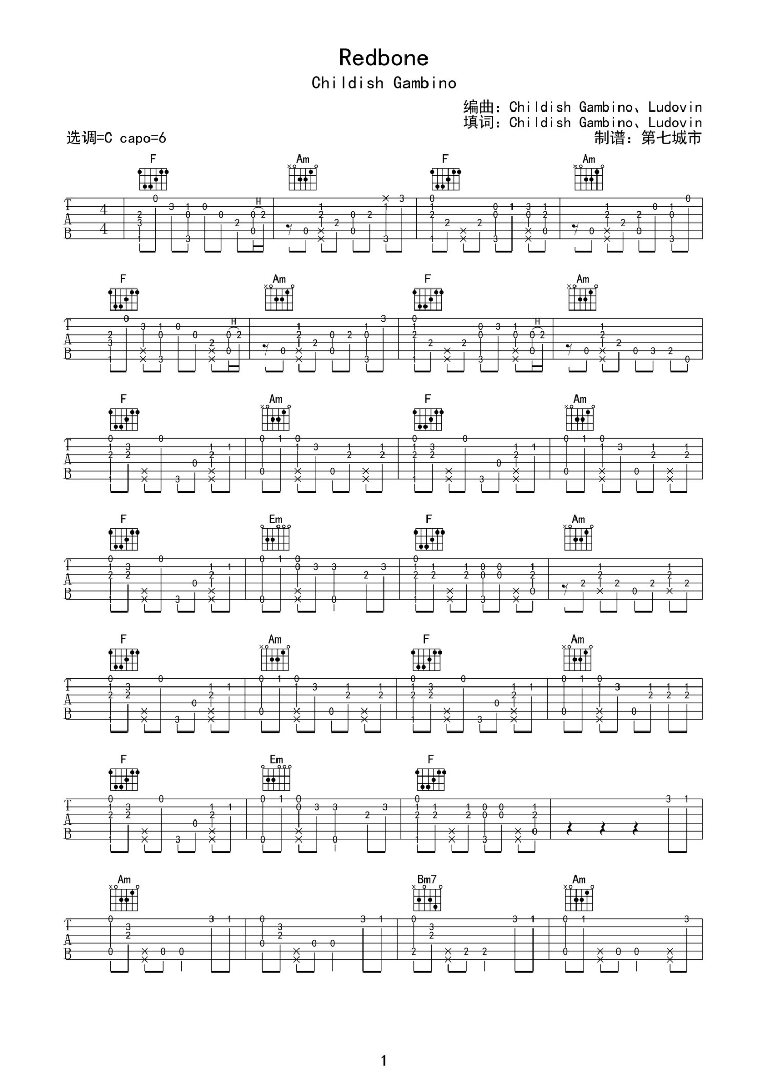• Redbone吉他谱 - Childish Gambino - C调吉他独奏谱第1张