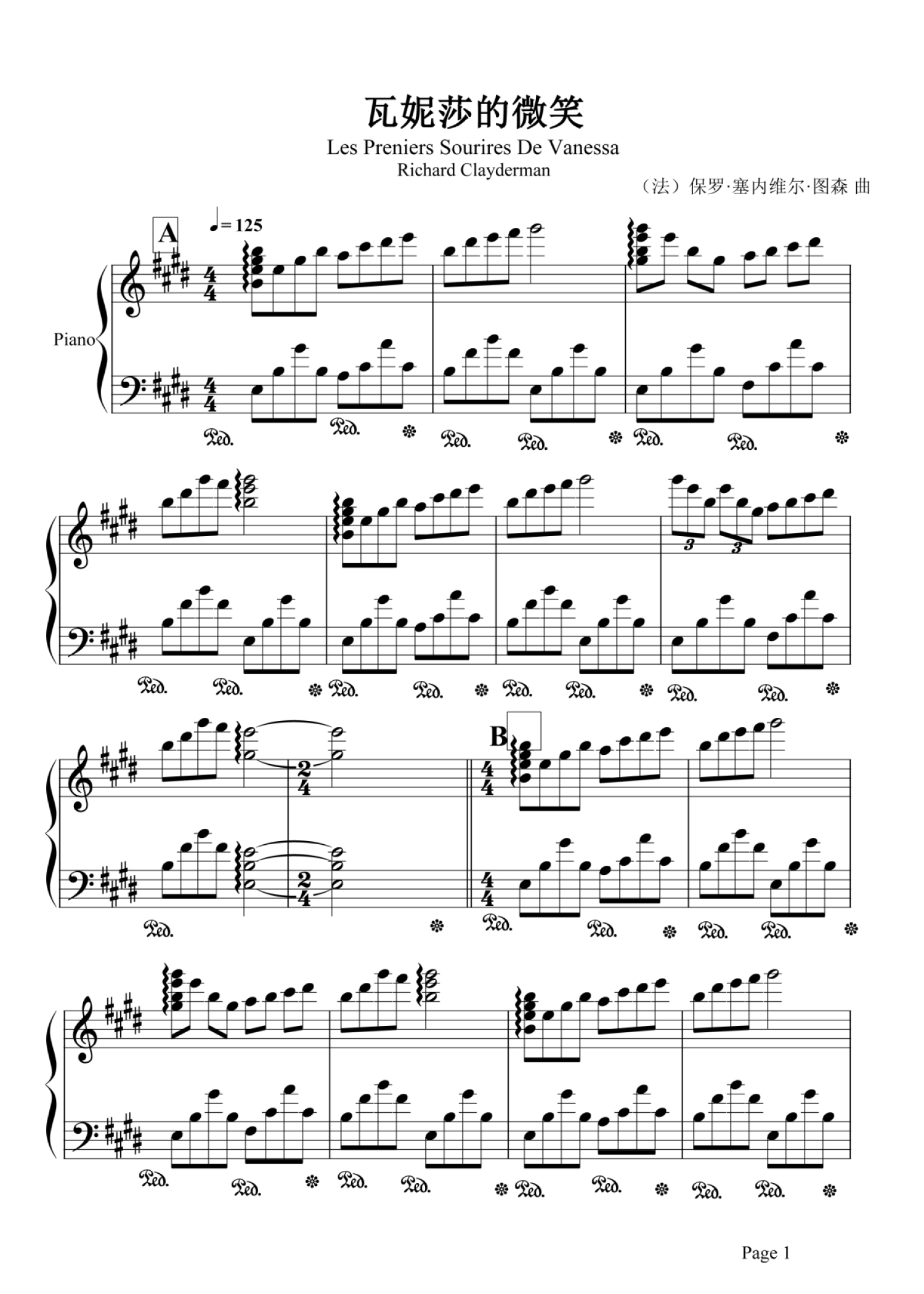 瓦妮莎的微笑钢琴谱 - 理查德·克莱德曼