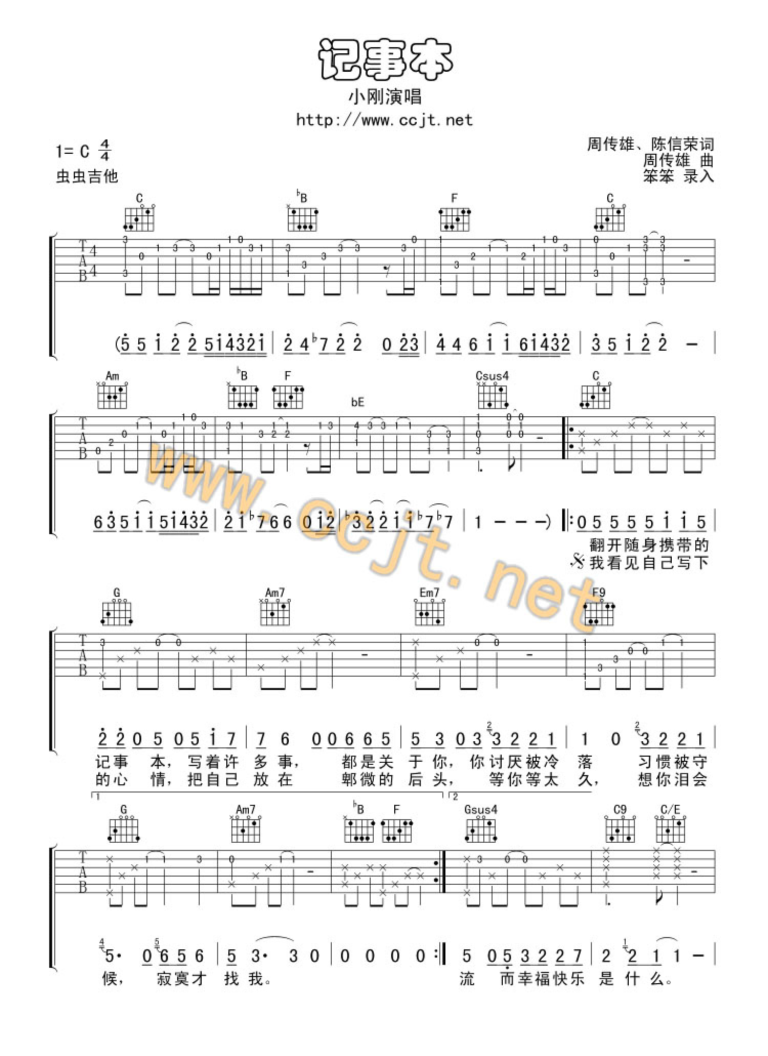 记事本吉他谱 - 小刚/周传雄 - C调吉他弹唱谱