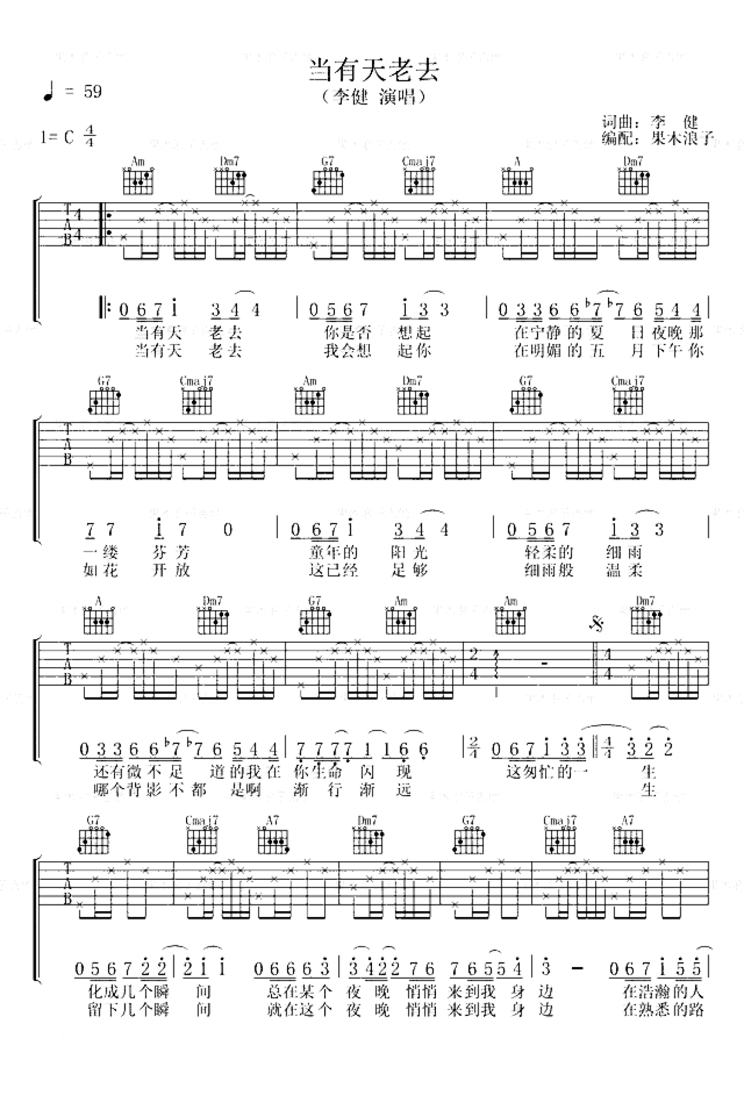 曲谱介绍: 李健《当有天老去》吉他谱_C调吉他弹唱谱