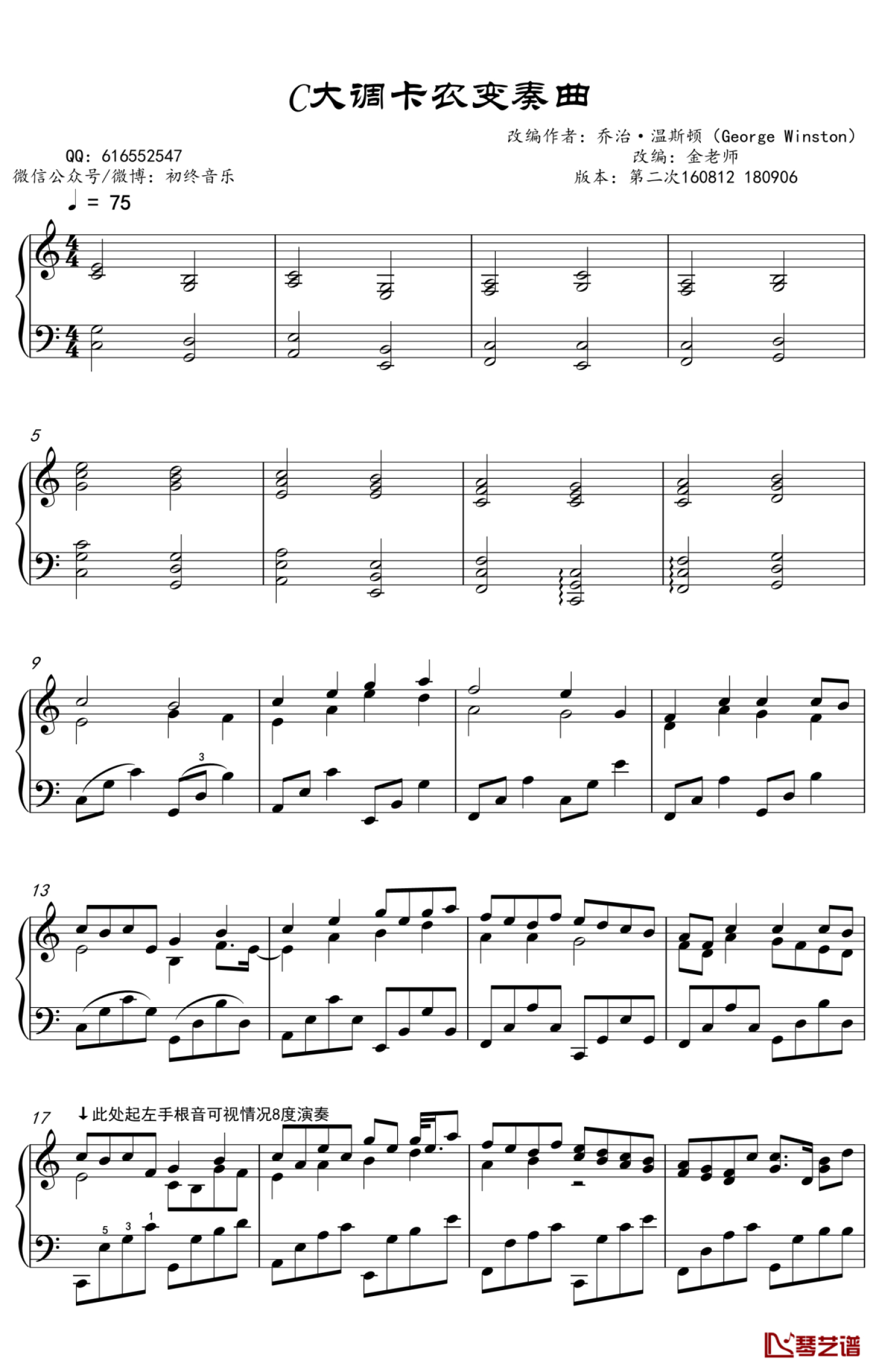 曲谱介绍: 金老师《C大调卡农》钢琴谱