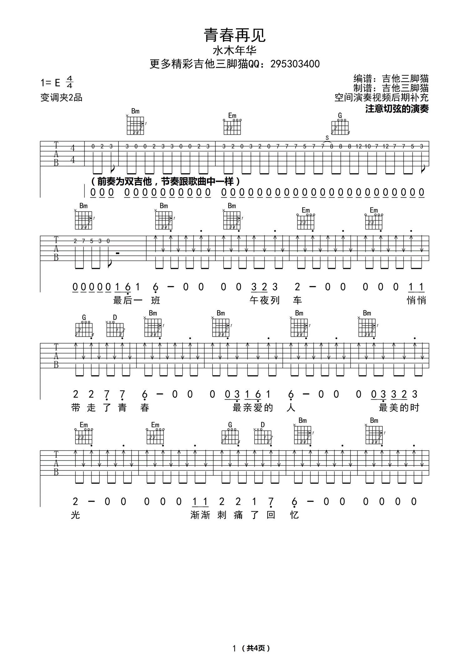 曲谱介绍: 水木年华《青春再见》吉他谱_吉他弹唱谱